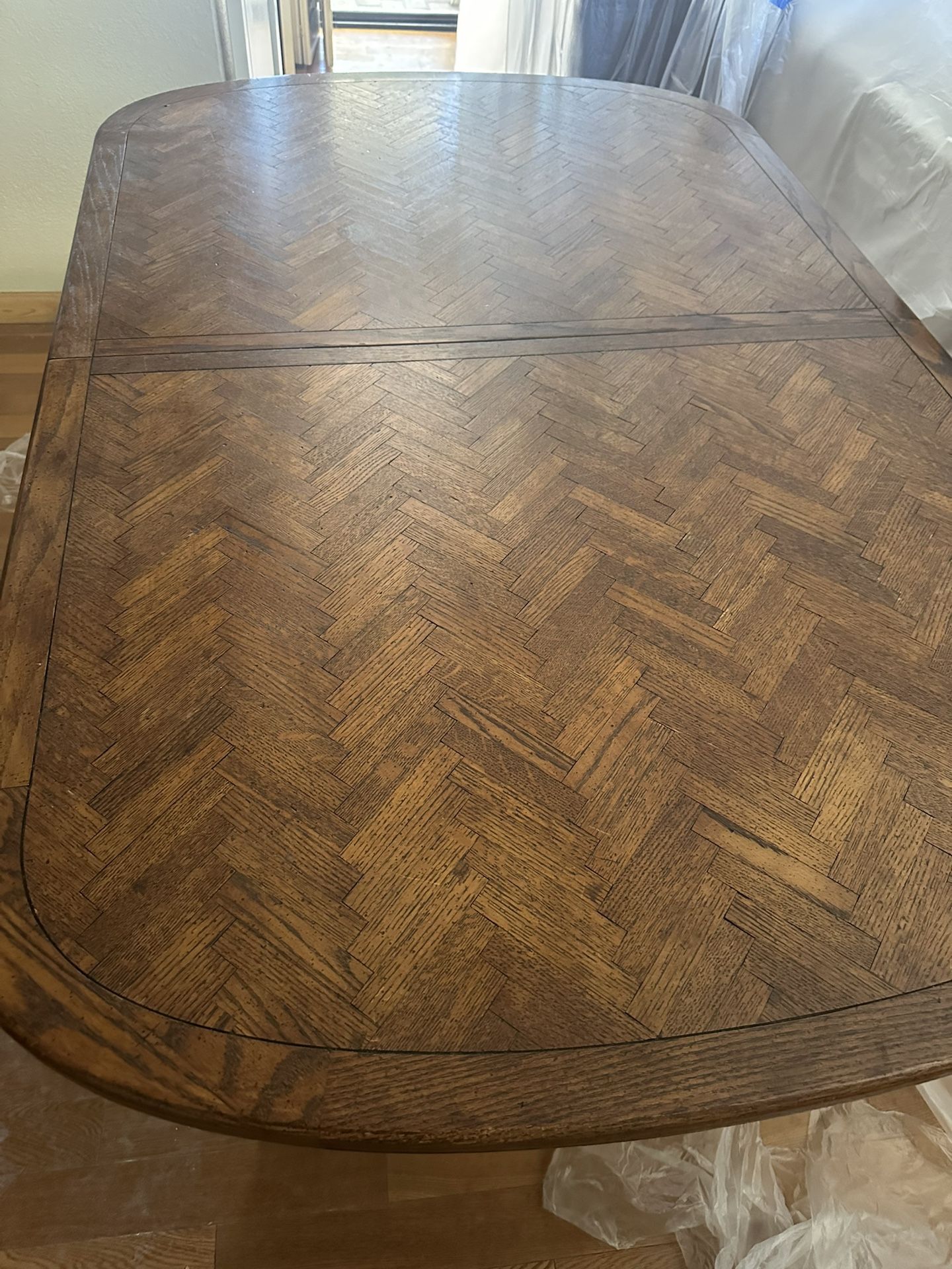 Not sure the maker, very nice solid table, has a few scratches on the legs and a couple holes in the back of the chairs…8 chairs. Roughly 64x42x30h with two additional 18” leafs (inserts)