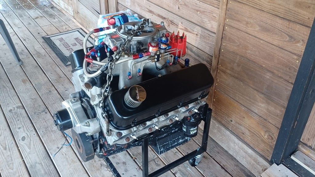 Stock 4 bolt main block, 4.(contact info removed) Eagle crank, Eagle rods, SRP dome pistons, Lunati .804/.755 camshaft, DART 355 CNC ported heads, Comp Cam rocker arms/stud girdle, DART intake, NOS Fogger.