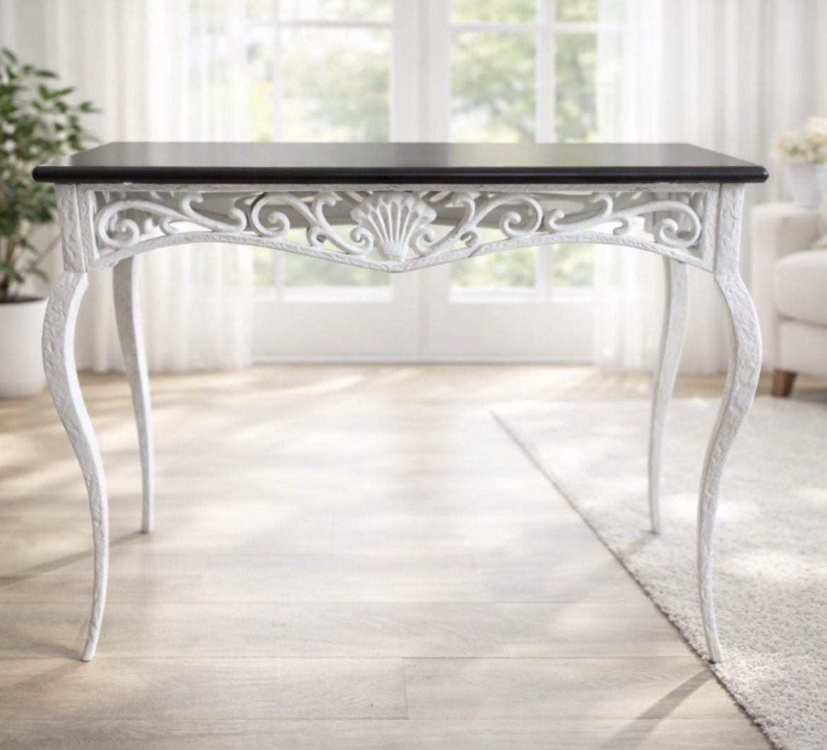 Refurbished Bombay stone top console table with iron legs. Length 35.5 x height 20 x width 14.25. Good sturdy condition but the stone top does have flaws , worn off color in some spots. See all of the pics. Price represents the imperfections . Currently located at Village Consignment Chelmsford,MA 17 Groton Rd. Middle White House - left side room. open Weds- Sunday 10-4. Please let me know if you pick it up so I can remove the post. Scroll through my listings and reviews!
