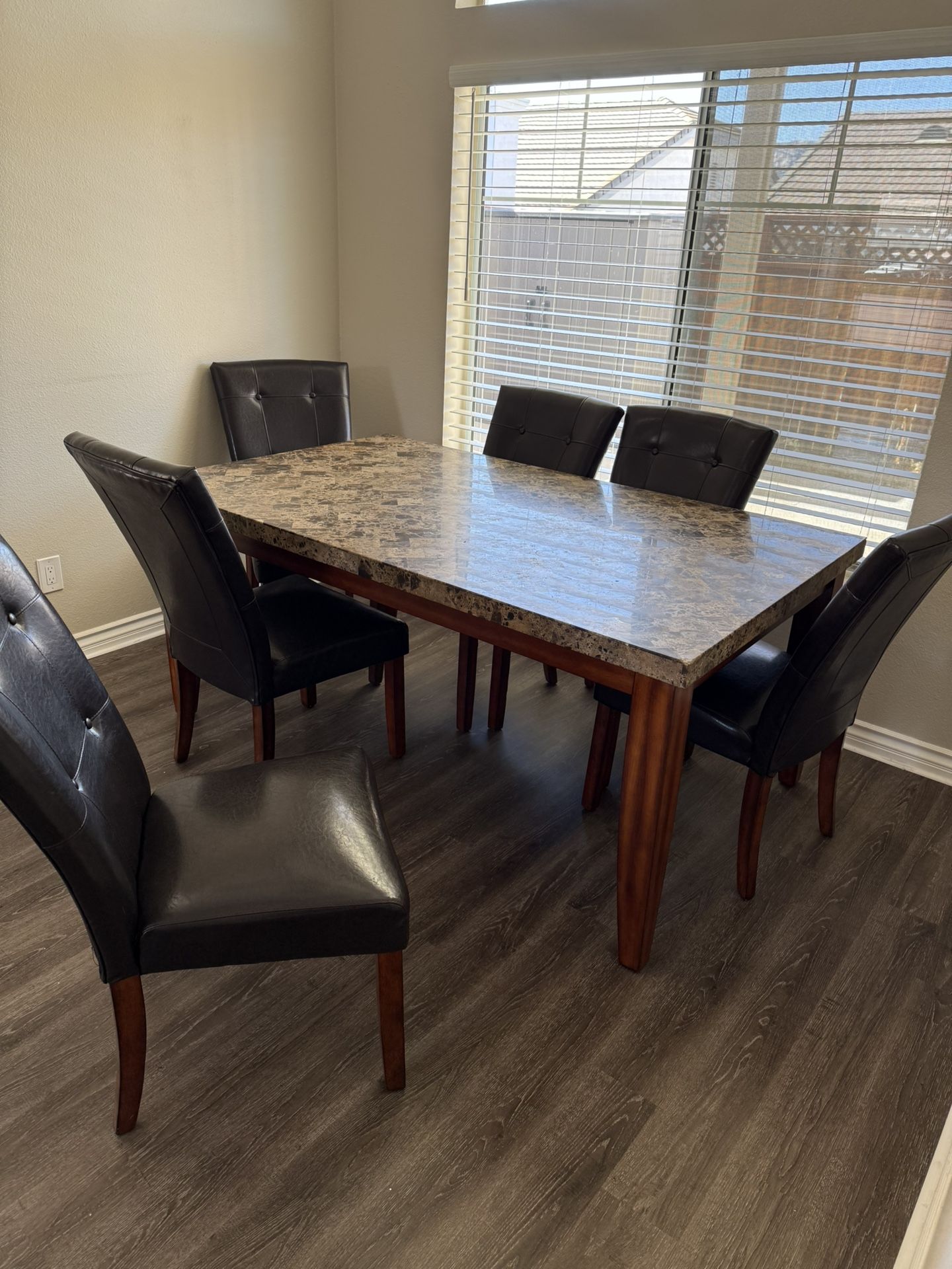 Dimensions: 70x41x31 Must pick up and disassemble. It’s heavy. Beautiful granite table and 6 chairs. All chairs are in great condition Table defects: - I chipped a corner off when moving it last. I epoxied it back on. Hasn’t moved since. Barely noticeable. Shown in the pictures - A thin piece of wood chipped off on the mounting part of one leg. It’s not visible and still bolted up fine. The all thread bolt may spin but is manageable. Best pic I could take is listed