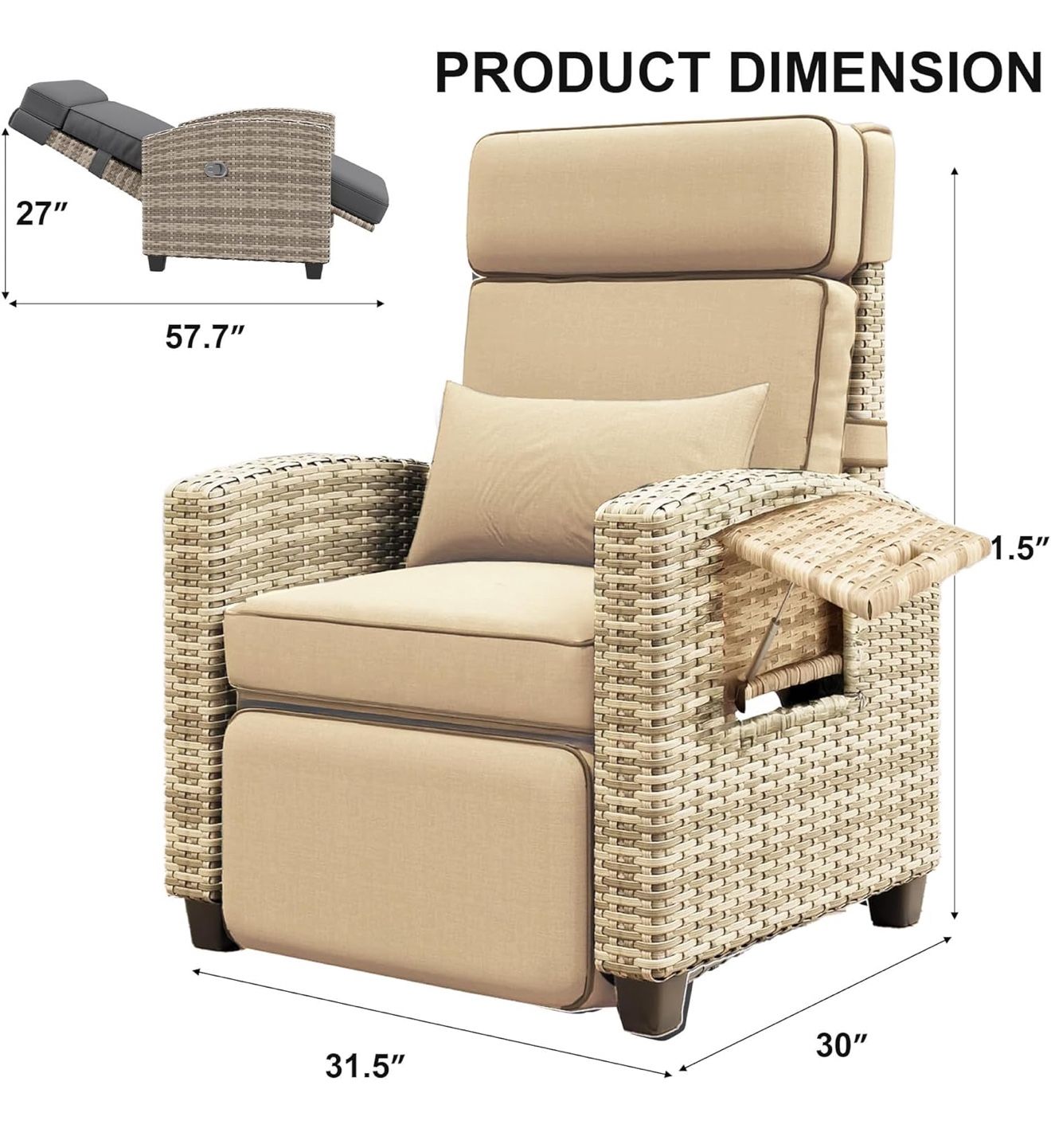 Garvee Outdoor Recliner Chair, 145° Adjustable Backrest & Footrest Lounge Chair with Removable Cushion and Flip-Up Side Table, All-Weather PE Wicker &