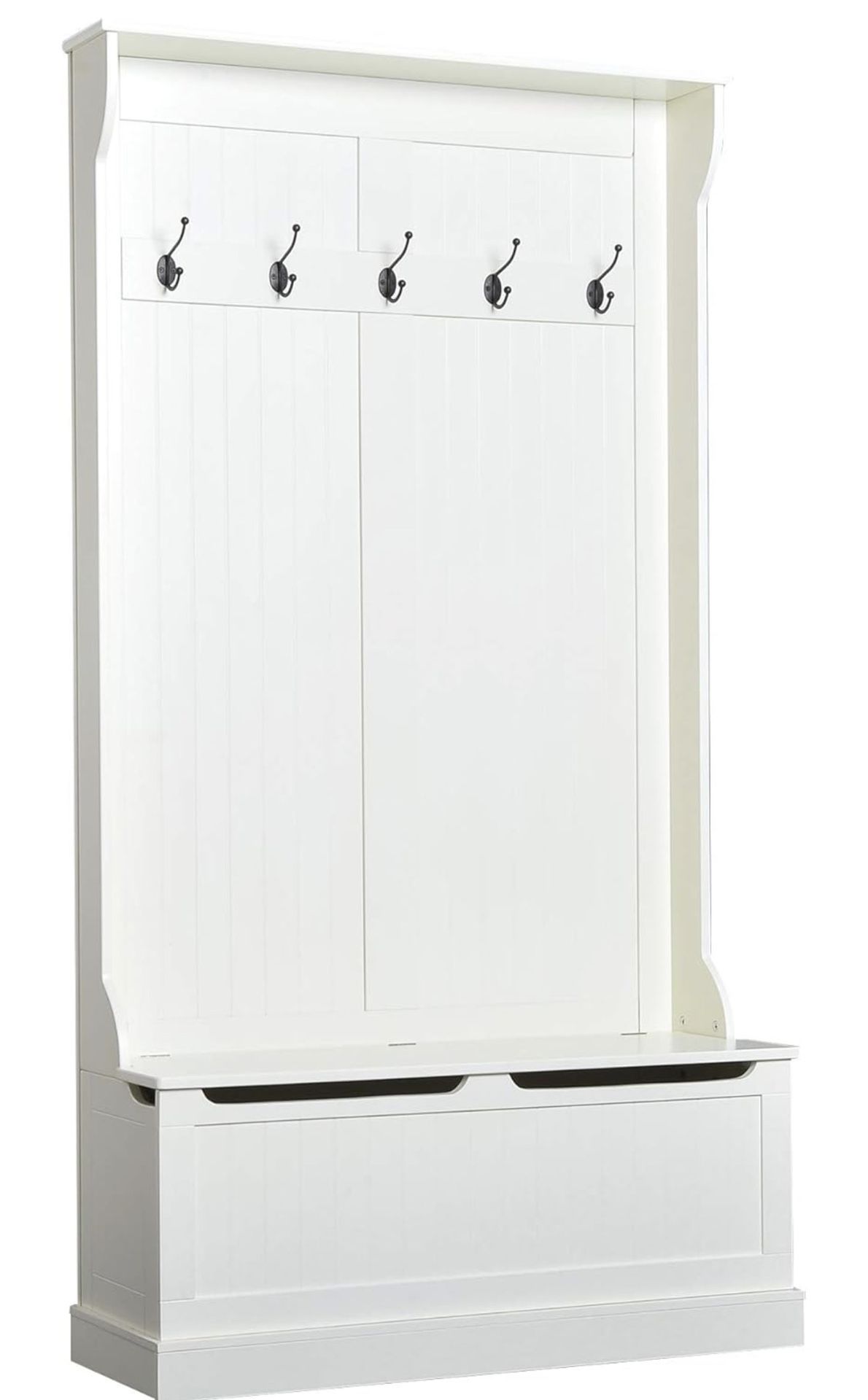 Off-white solid entry hall bench/storage & coat hanger all in one.