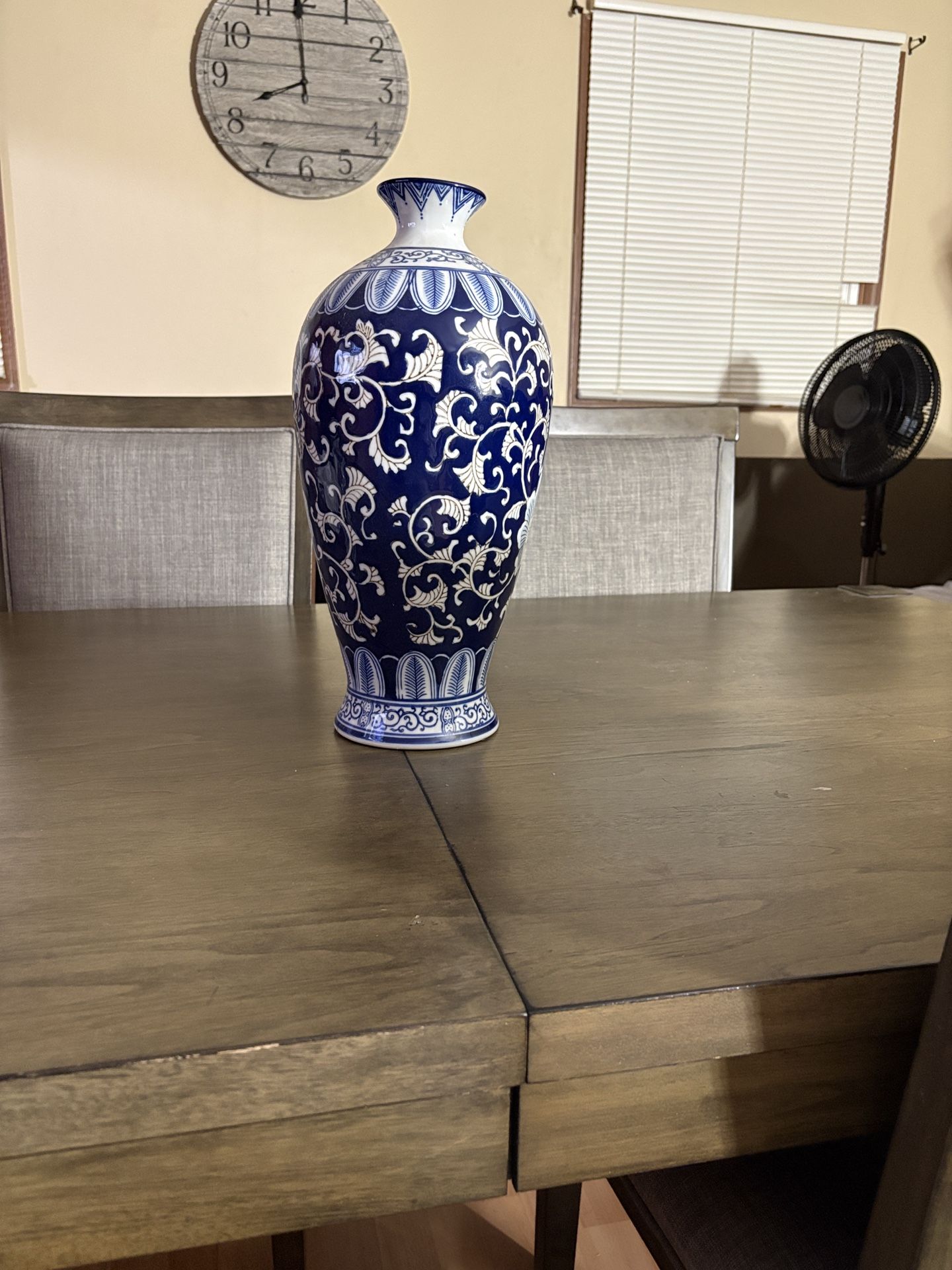 Elegant blue and white porcelain decorative vase featuring detailed floral and scroll patterns. A timeless accent piece perfect for kitchen counters, shelves, mantels, or entry tables. This vase looks beautiful displayed on its own or styled with faux or dried florals. Classic design works well with modern, traditional, or transitional décor. ✔️ Excellent condition ✔️ Decorative use ✔️ Carefully packed for safe shipping Local pickup or shipping available. Message me with any questions.
