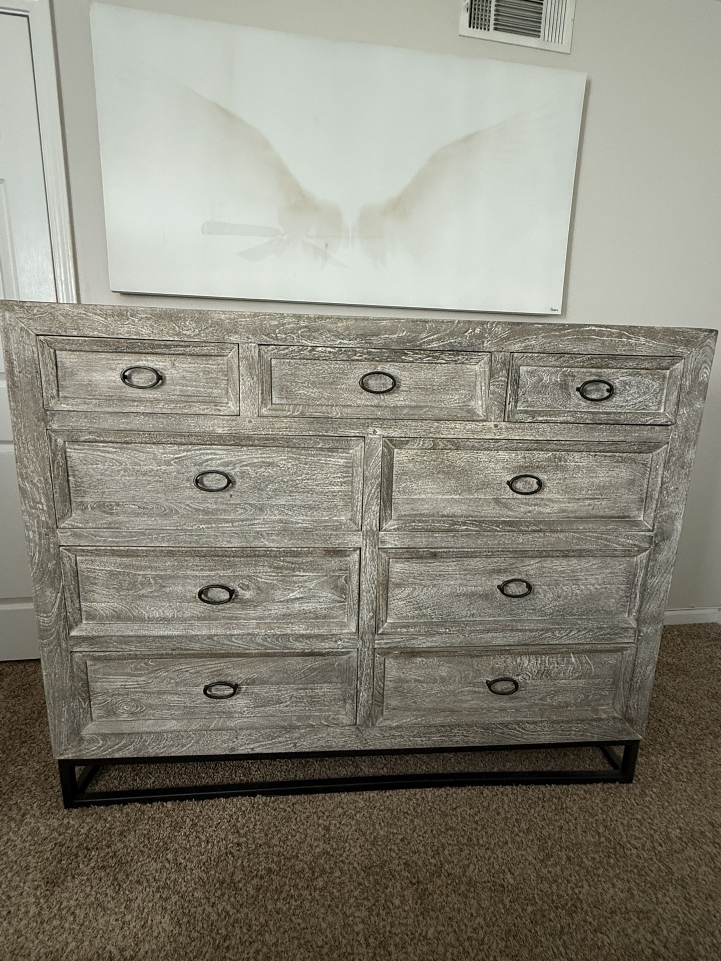Large, solid wood dresser / sideboard with substantial weight and excellent storage. This is a handcrafted piece made in India, not veneer or MDF. Extremely sturdy and well-built. Details: • Dimensions: 60” L x 20” D x 47” H • 9 drawers total • Top row: three drawers (16” / 20” / 16” wide) • Lower drawers: six drawers, each approx. 27” wide • Traditional wood-on-wood drawer glides • Solid brass ring pulls • Raised on a metal base Condition: • Overall very good condition • Normal wear consistent with age and use • Drawers glide smoothly and are structurally solid Important logistics (please read): • This piece is extremely heavy • Located upstairs in a townhome • Buyer must arrange for movers • I can recommend a mover if needed, but removal is the buyer’s responsibility Priced accordingly for size, weight, and required moving logistics. Pickup only. See my other listings for coordinated pieces.