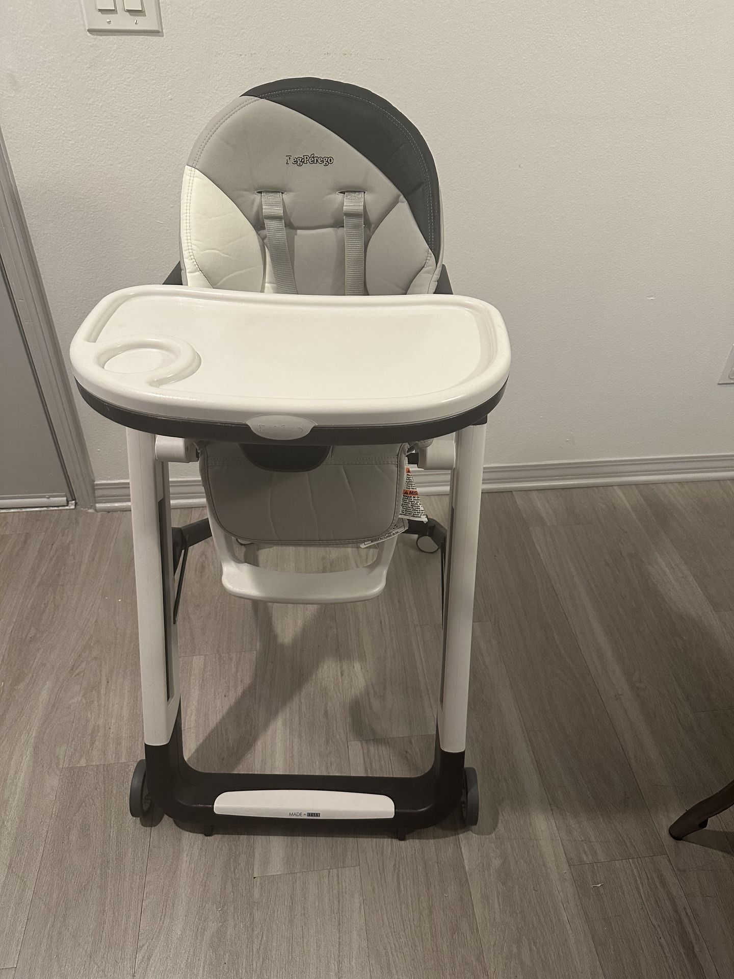 Bistro table with 2 chairs, kids slide, playmat, pack n play, stroller, peg perego high chair, metal shelving