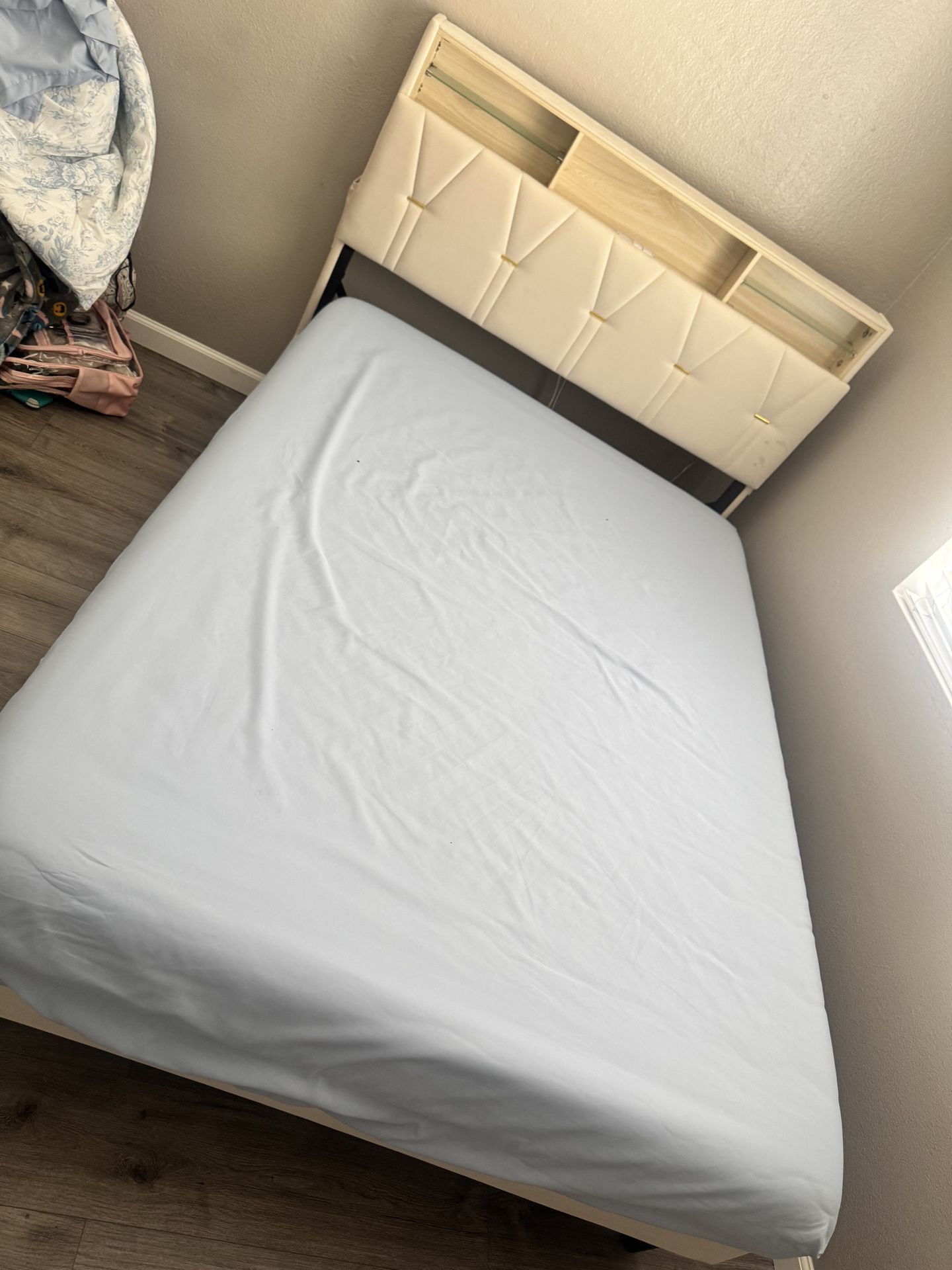 Full bed frame. No mattress included. Has led light that go on bottom of bed frame and electrical plugs. Also opening for storage.