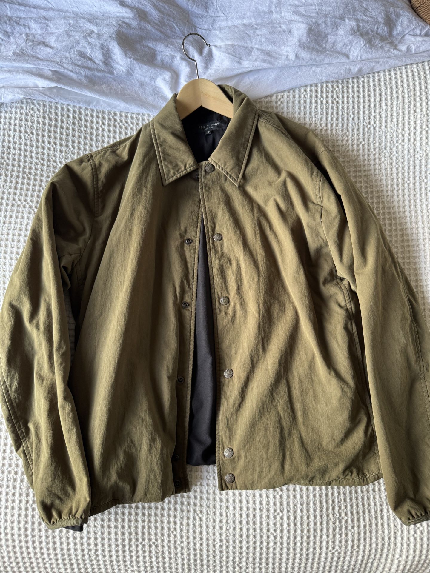 Hello! I have for sale a well taken care of men’s Rag and Bone filled green shirt jacket. Details: - Size: medium - Color: green - All buttons are functional - No rips, stains or fraying. Please let me know if you have questions! Happy to make a bundle deal if you buy more items from my page!