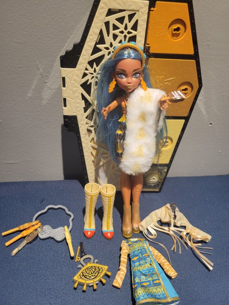 This is a Monster High Skulltimate Secrets Fearidescent Cleo De Nile doll, which comes with a locker-style case and multiple surprise accessories. The doll features a shimmery skin tone and all-blue hair. It is part of the G3 reboot of Monster High dolls.