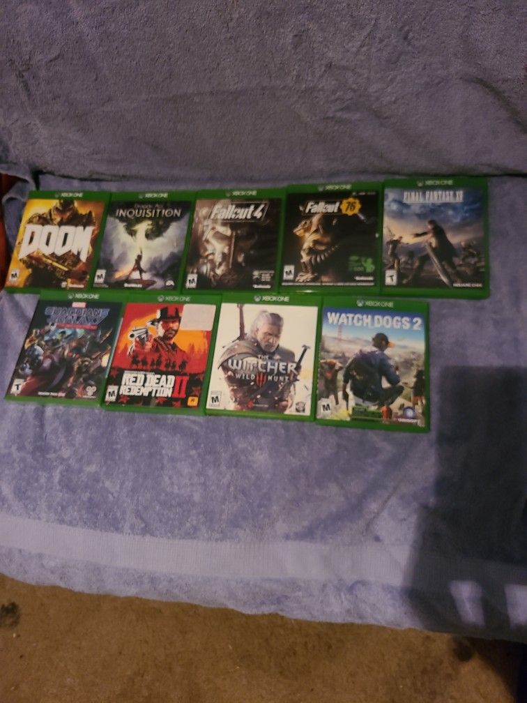 Games included: Doom (2016) Dragon Age: Inquisition Fallout 4 Fallout 76 Final Fantasy XV Guardians of the Galaxy – The Telltale Series (factory sealed) Red Dead Redemption 2 The Witcher III Watch Dogs 2 All discs are in good condition with no scratches and have been tested. Mild case wear. All games are Xbox One versions. Prices are firm unless buying the full bundle.