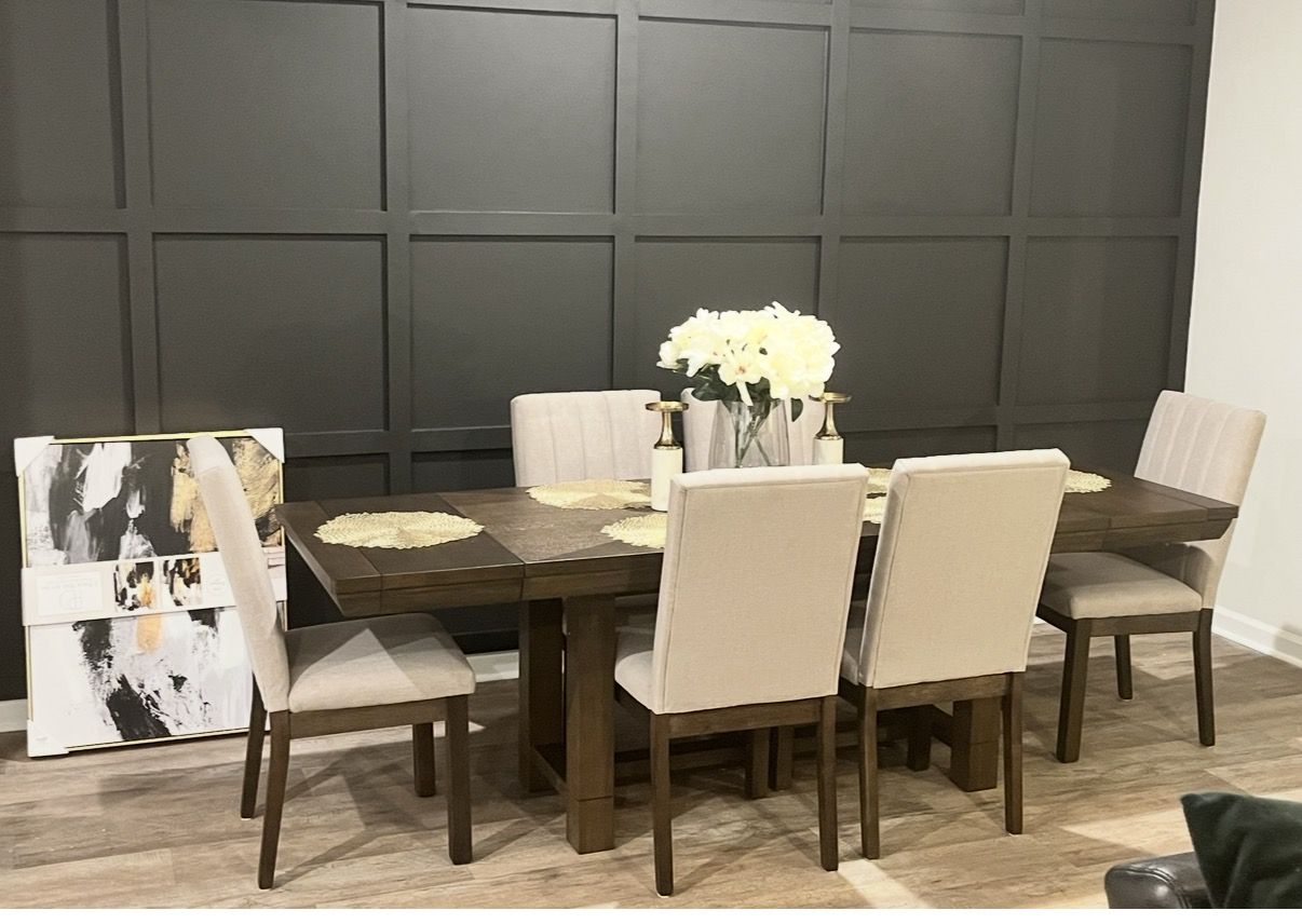Modern Dark Wood Dining Table + 6 Upholstered Chairs (Includes Extension Leaves)
