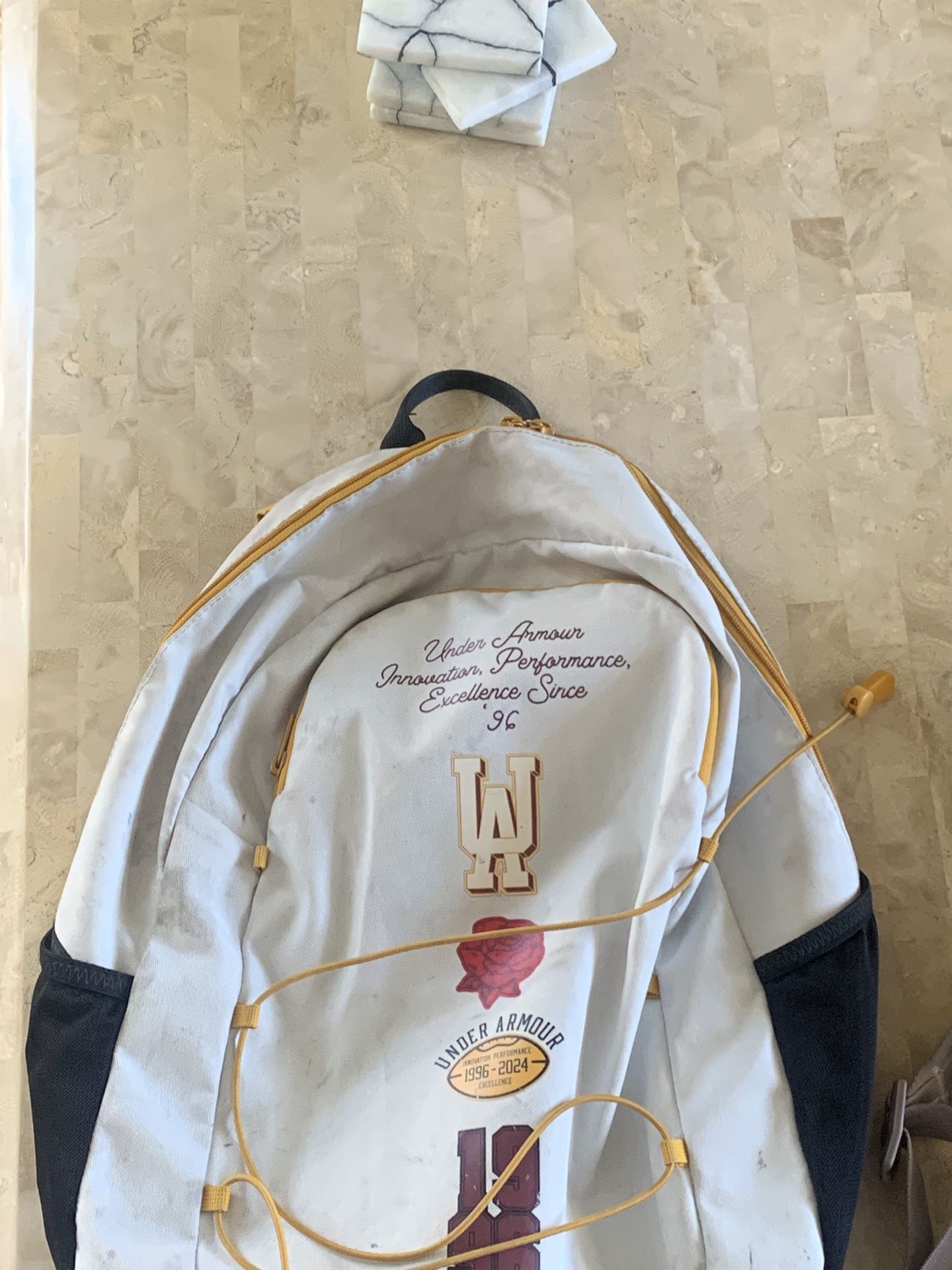 White/Gold/Red – “Innovation, Performance, Excellence Since ‘96”) • Cool vintage look with college football vibes • Spacious with front bungee cords and side pockets • Gently used with some cosmetic wear (can be cleaned)
