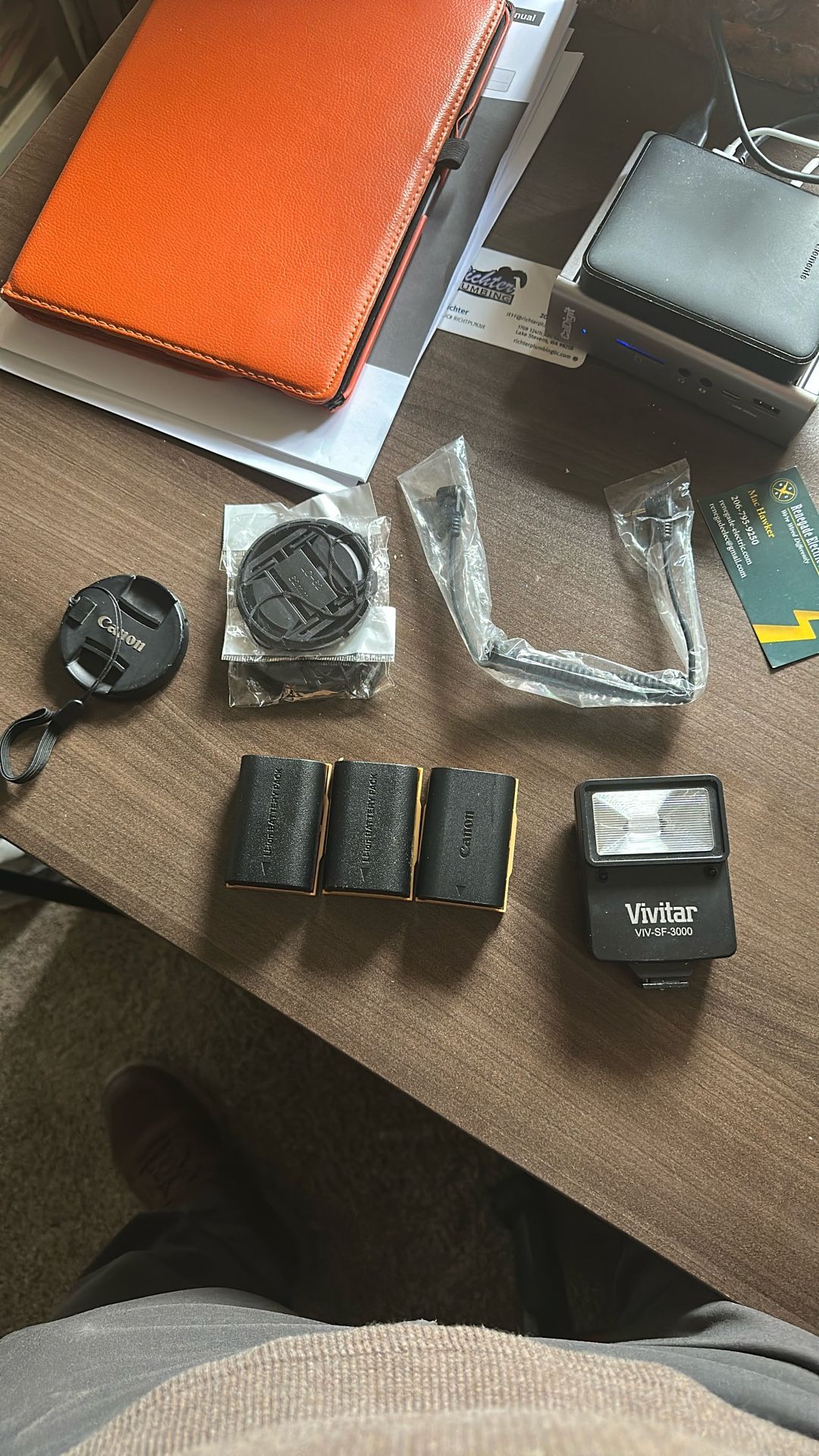 EOS5DSR one original two powerextra 7.4v 2600mAH 19.2Wh plush Vivitar viv-SF-3000 an some lens caps traded in camera trade in didn’t want batteries Glazer camera seattle so i have them no use to me…all for $30.00