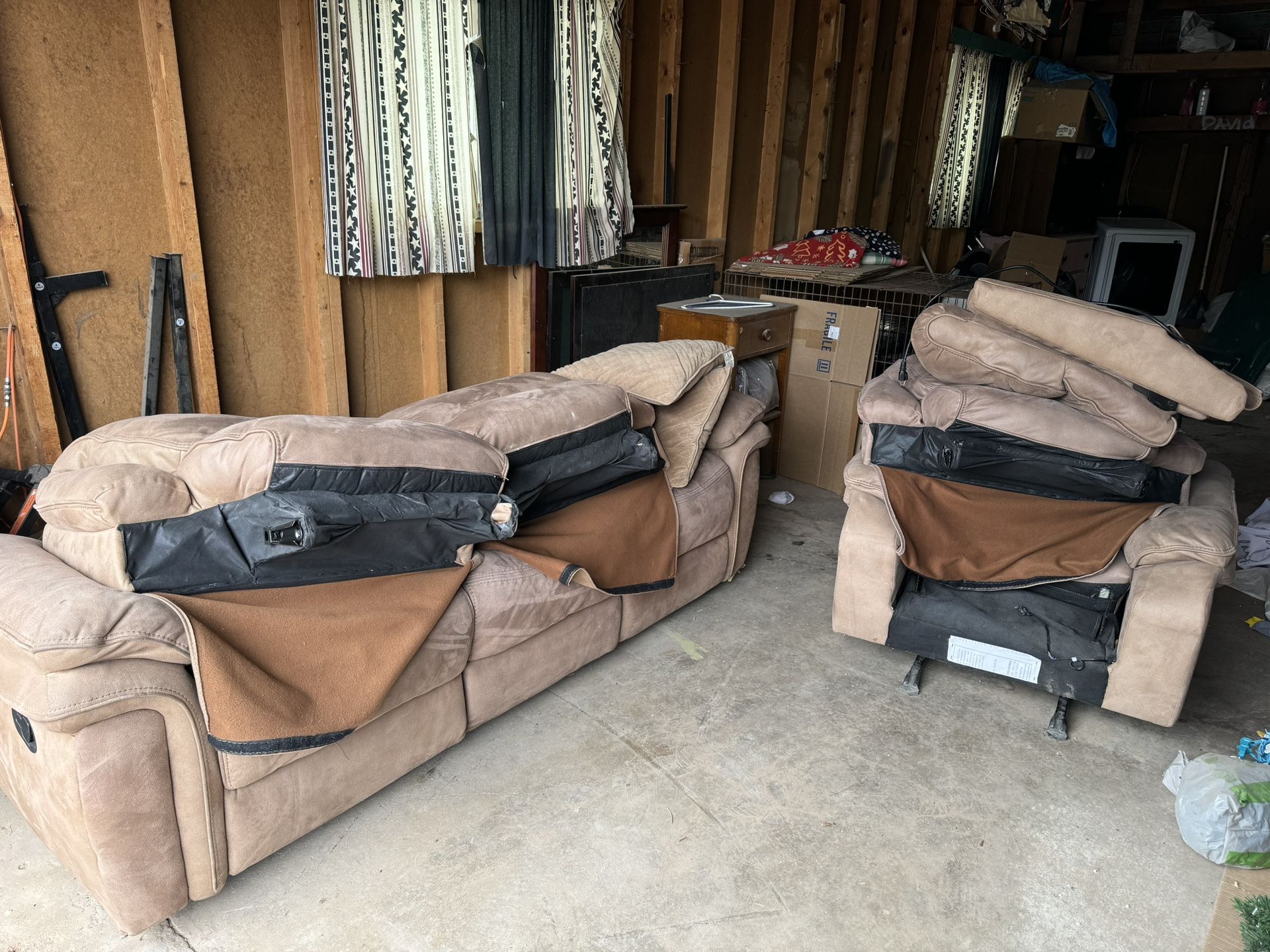 In good condition has a tear on bottom right corner on long couch & have a recliner nothing wrong with it