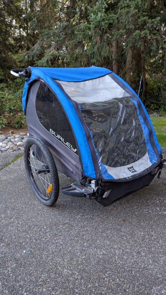 Burley 2 seat bike trailer. Includes add-on stroller wheel kit ($100 new) and bike hitch. Well loved but all parts are present and work great. One of the windows has been patched for as long as we've had it.