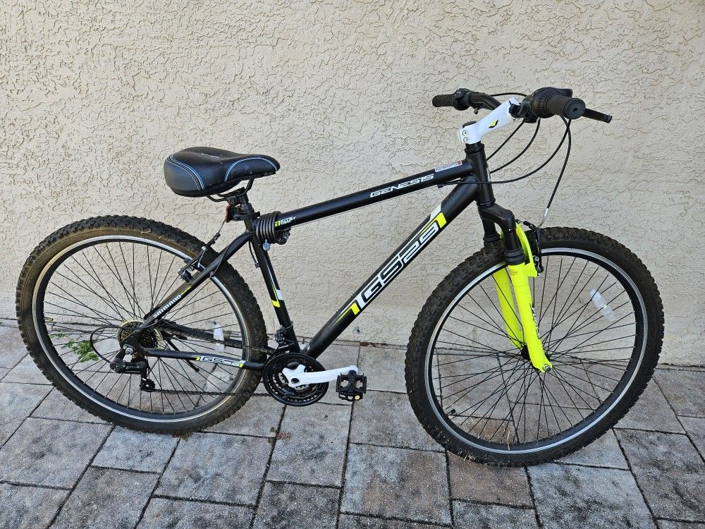 Perfect Like New Incredible Bike! Genesis GS29 Lightweight Aluminum Alloy Tubing Mountain Bike Bicycle 7 Speed Beach Cruiser This bike is slightly used, ridden only a handful of times. Tires are fat type for easy riding on both roads, sidewalks or offload terrain. Has cushion forks in front for a smooth ride on any bumpy surfaces. Has an upgraded seat that offers a wider seating area for comfort. Nice tires Pressure brakes Replaceable brakes pads Seven speeds Aluminum frame Cushioned fork Upgraded wide seat Genesis 29 In. Incline Men’s Mountain Bike 29″ Tire Size Lowest Stand over Point: 29 1/4″ Aluminum four bar linkage suspension frame Spring loaded suspension fork Front disc brakes Rear linear pull handbrakes 21 speed drive-train Revo twist shifters from Shimano Comfortable riding position featuring a padded saddle Rise handlebars