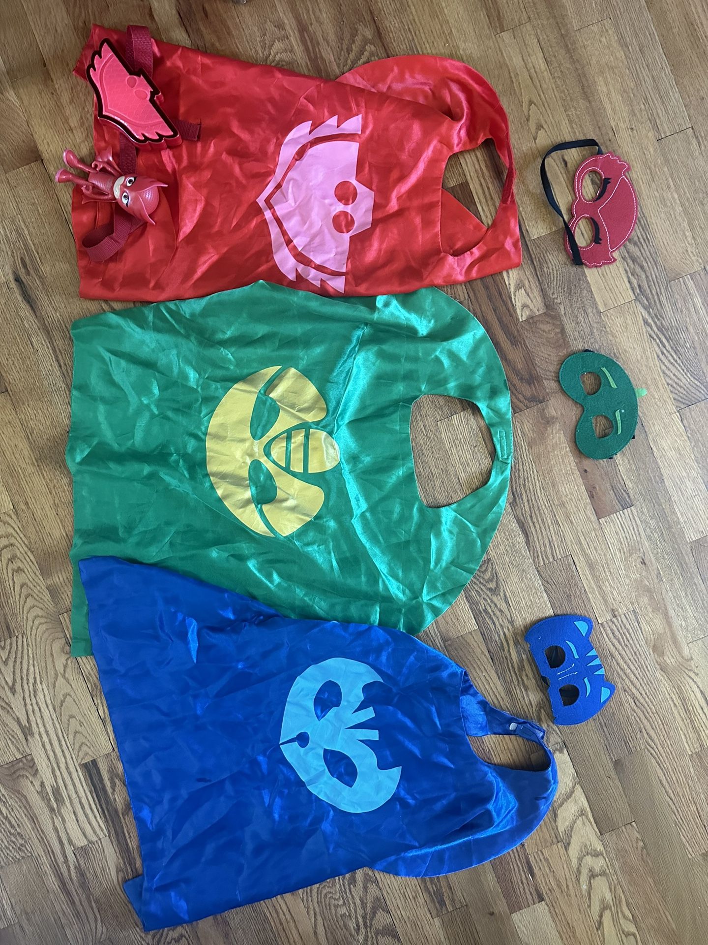 Three PJ Masks dress-up capes and masks for kids. Plus Owlet Doll and belt.