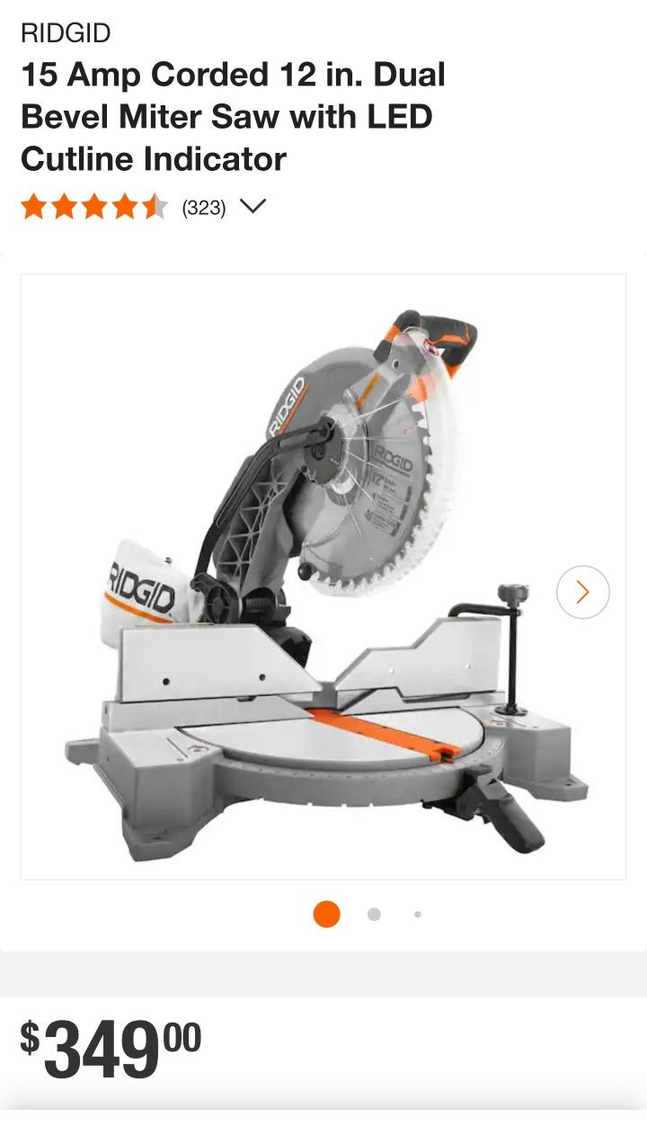 RIDGID 15 Amp Corded 12 in. Dual Bevel Miter Saw with LED Cutline Indicator Brand New unopened Original Price $350 • Cuts a 2x8 or 4x6 in a single pass at 90° • Cuts a 2x6 in a single pass at 45° • Powerful 15 Amp motor powers through the most difficult materials • Adjustable miter and bevel detents with bypass feature for improved accuracy • Dual bevel design with 7 positive bevel stops at 0°, 33.9°, 45°, and 48° left and right • 9 positive miter stops at 0°, 15°, 22.5°, 31.6°, 45° left and right • Blade brake stops blade in seconds for quicker transitions between cuts • Sliding miter fences provide support for wider material and adjusts for bevel cuts • Zero-Clearance Throat Plate - Gives material maximum cut-through support • Built-In 2-1/2 in. dust port maintains optimal position for superior dust collection • LED cut line indication and work light for improved visibility • Compatible with the AC9946 RIDGID Universal Miter Saw Stand • Lifetime Service Agreement with registration within 90 days of purchase • Includes: R4123 12 in. Dual Bevel Compound Miter Saw, 12 in. Carbide Tipped Blade, Dust Bag, Material Clamp, Blade Wrench/Hex Key, and Operator’s Manual • For more RIDGID benchtop tools eligible for the Lifetime Service Agreement, click on the image below • RIDGID: Build for a Lifetime