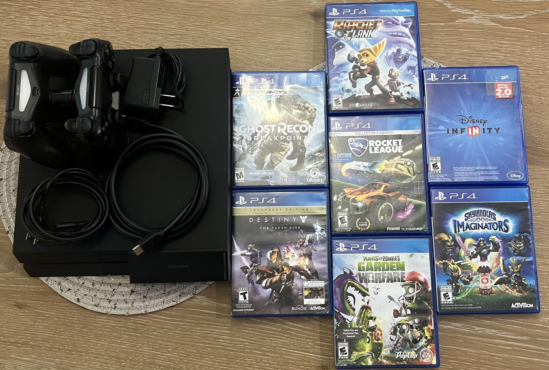 This PS4 bundle includes everything needed for plug-n-play: 500GB Console (Perfect Condition) Power Cable Two controllers 6 Games HDMI Cable Bonus items: Charging station for the controllers A set of speakers (Shown in pictures) Front Panel USB extender The price includes everything. Thanks.