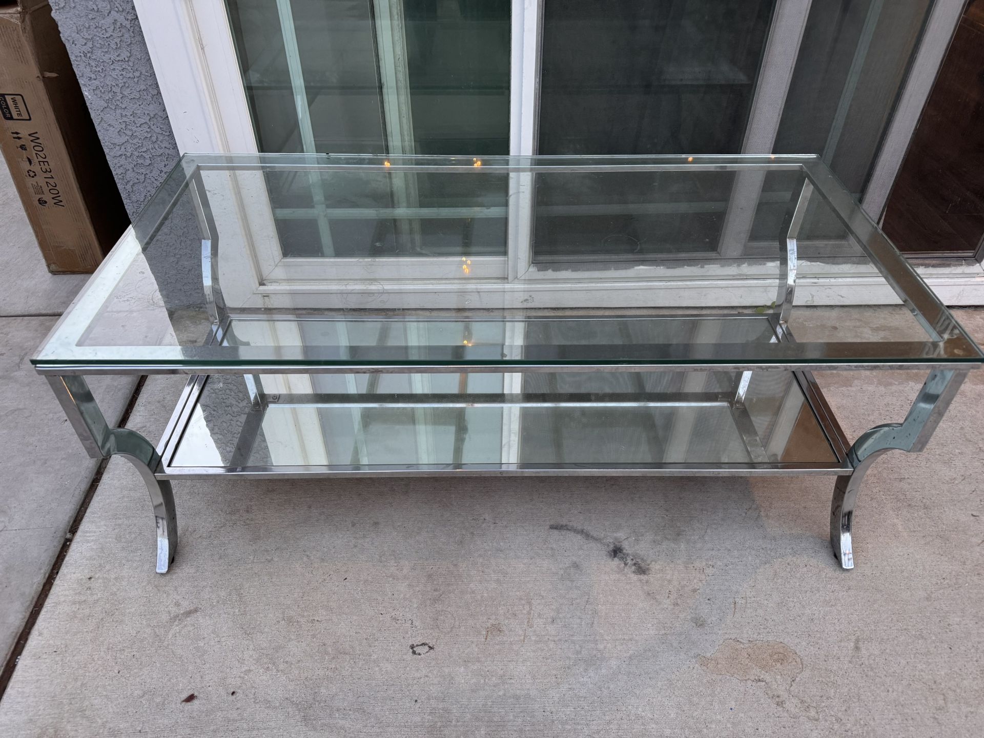 Beautiful glass coffee table with a sleek mirrored/chrome metal frame. Features a clear glass top and lower shelf for extra storage or décor. Elegant curved legs give it a modern glam look that works great in living rooms, offices, or sitting areas. Details: • Two-tier design (top + bottom glass shelf) • Clear glass panels • Mirrored/chrome metal frame • Sturdy and stylish Fair condition – ‼️Has one chip on the frame‼️(shown in pictures) Approx. Size: 47.5in x 23.75in x 19in