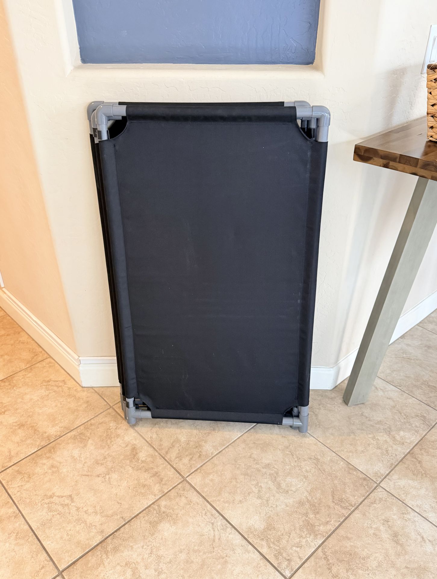 Heavy-duty 3-panel foldable safety barricade. • 5.8 ft wide when extended • Durable PVC frame • Black panels • Folds compact for storage Very sturdy and lightweight. Cash only.