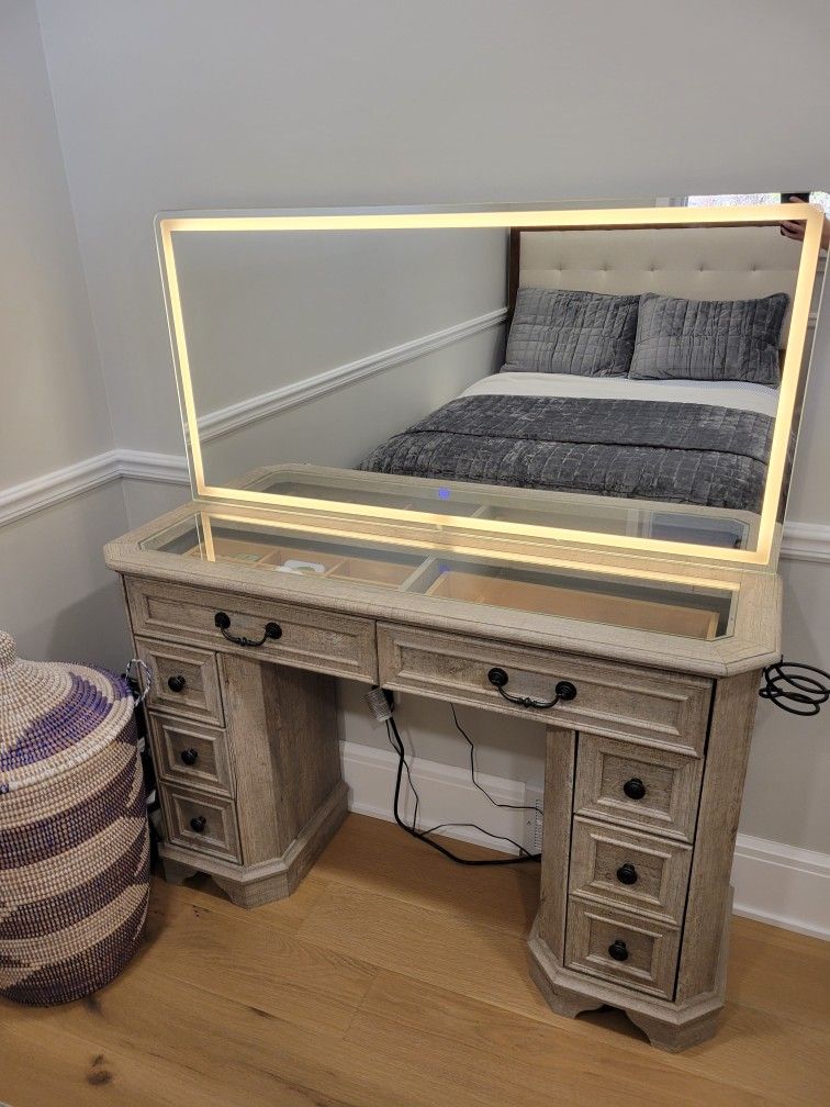 Accepting reasonable offers. Installed but never used. Paid $400. Product Dimensions48"D x 14"W x 53"H Color is Light Oak Vanity comes with a lighting system with a touch-sensitive LED mirror that offers three color temperatures (warm/neutral/cool) and adjustable brightness levels.