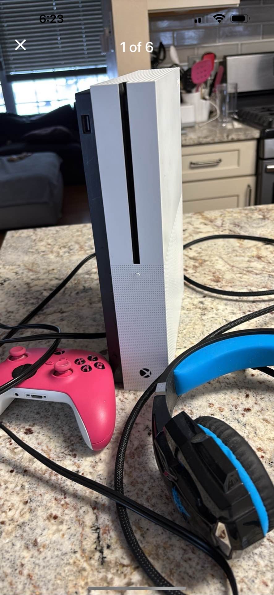 Microsoft Xbox One S (500GB) Gaming Console - White. Model 1681. Features: 4K Ultra HD Blu-ray and 4K video streaming. Also has headset and pink controller