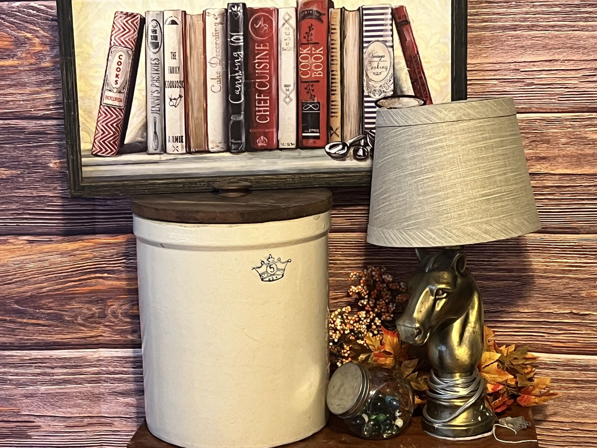 Antique-Vtg. Crown 5-Gallon Pottery-Stoneware Crock $85.00 Cookbook decorative art $15.00 Vintage horse head lamp $85.00 Vtg marbles in container $ 20.00
