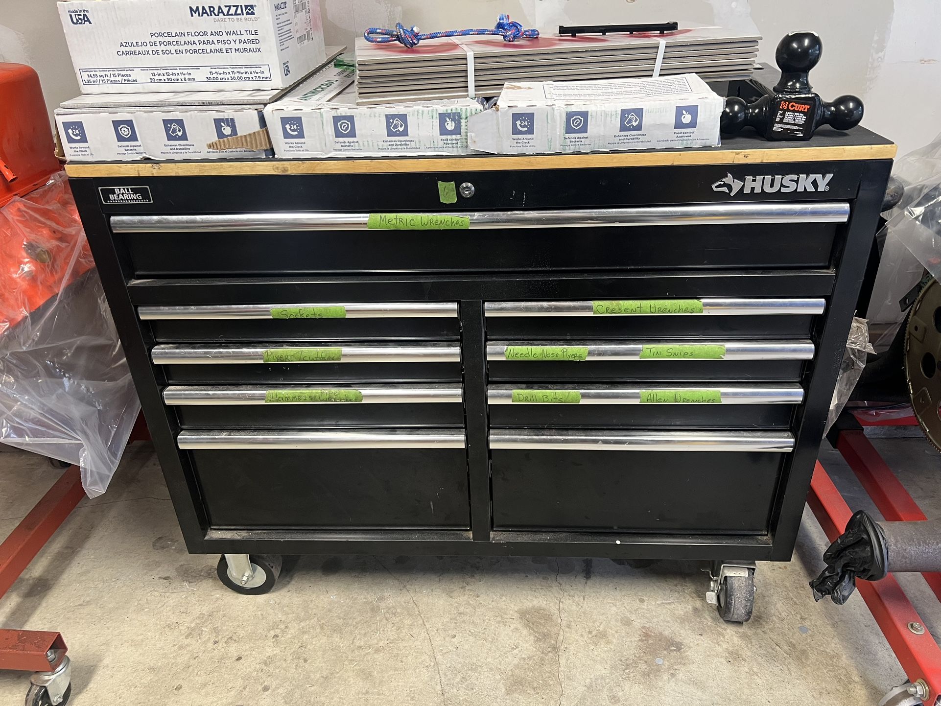 I have a Husky tool box that is 1 year old. The tool box has no dents or damage. I put a hard rubber matt on the top to keep from damaging the wood top. Cleaned up it will look brand new. I paid over $400. For this tool box. I purchased it from Home Depot and I put a photo of the tool box and the price I paid for it. Down sized my garage and don’t have room for it because I have 4-more that just barely fit in my garage. You can buy this one for $275.00. I will clean the tool box so it will look new when I’m done.