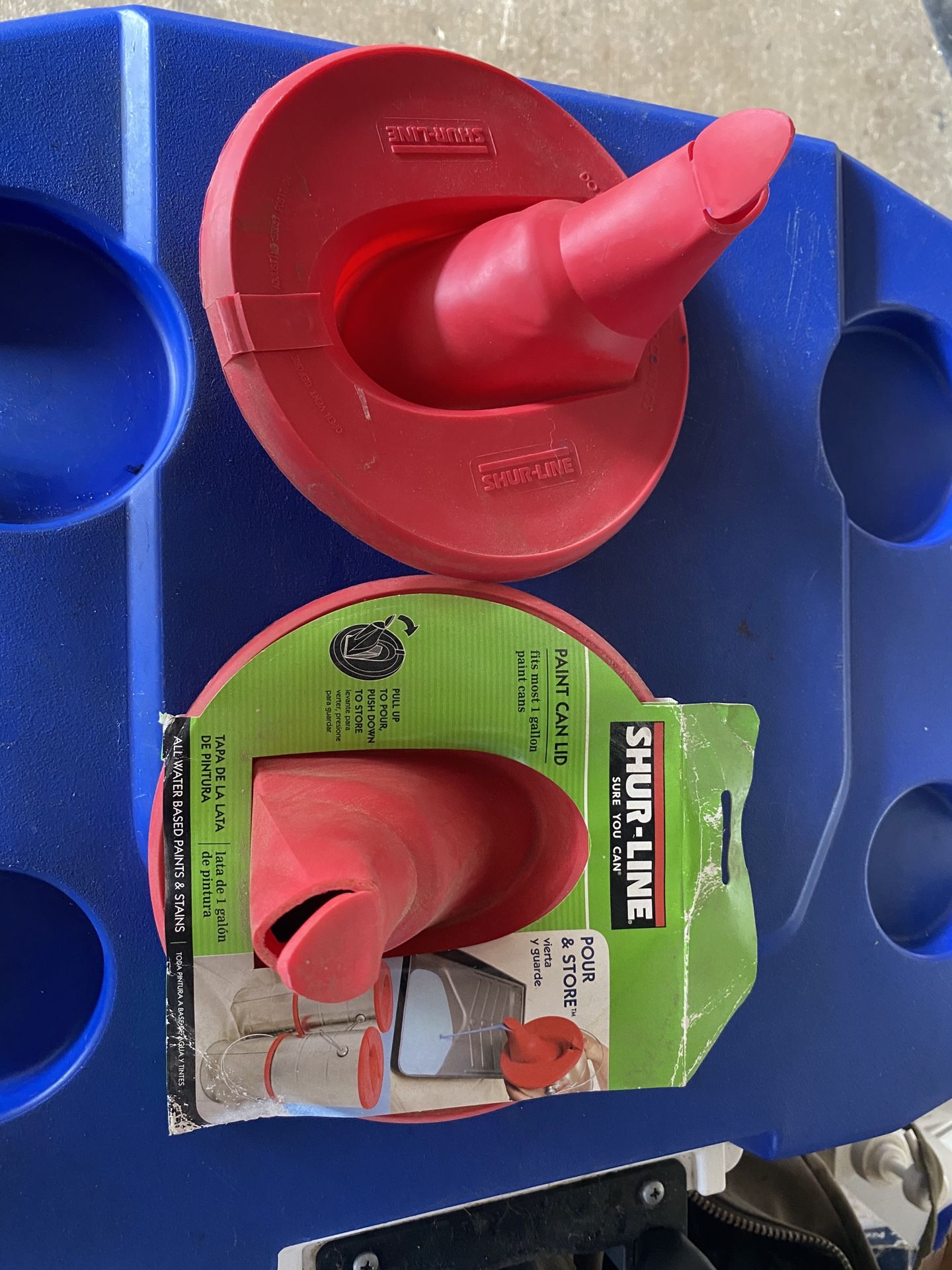 2 New Shur-Line Red Silicone Mess-Free Store and Pour Collapsible Paint Can Lid Both for $15 About this item Plastic Imported BUILT-IN AIR VALVE so you can pour your paint only when you decide POUR water based paints or stains EASILY CLEANED: designed to minimize crevices and hard-to-reach areas so you can keep this accessory like new COLLAPSIBLE TOP lets you stack your accessorized paint cans on top of each other AIRTIGHT SEALING keeps paints as fresh as the day you bought them