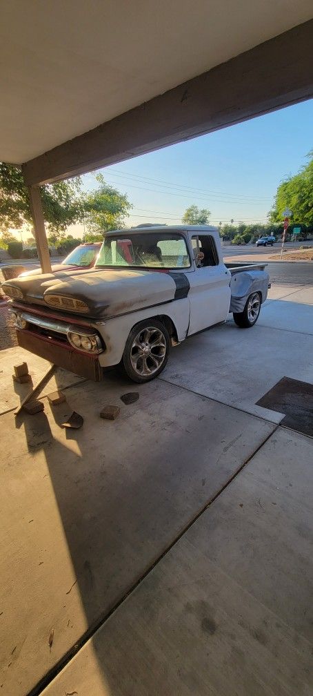 61 Chevy short bed truck with 5.3 and 4l60 in good running condition body need some work 4 disk brakes all way around no ac just need freon 2001 dash cluster 5 links with coilover suspension 20 inch tires power brakes and power steering turns in a dime