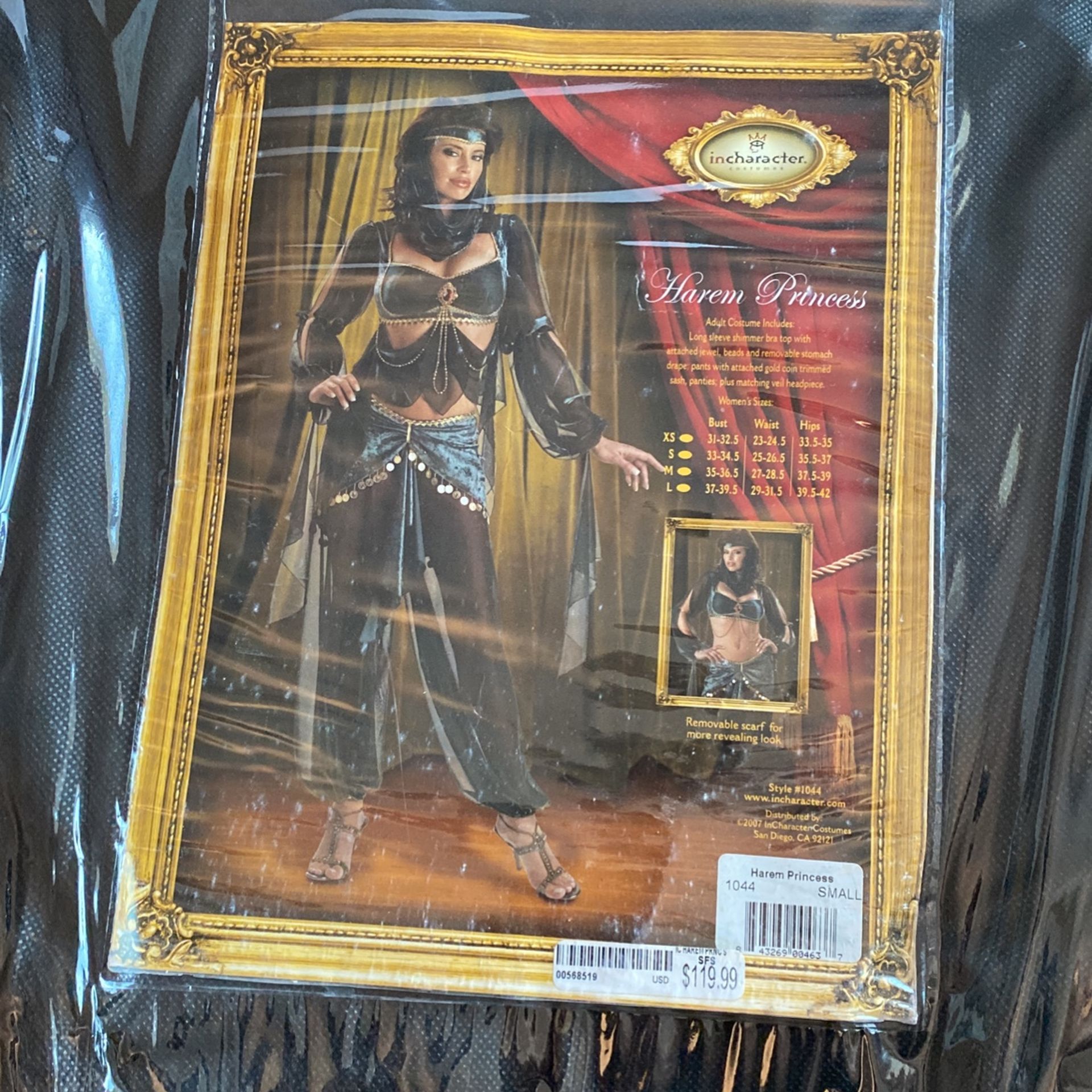 Halloween complete full costume set of Harem Princess Adult costume includes: Long sleeve shimmer bra top with attached jewel Removable stomach drape; Pants Panties ; plus matching veil headpiece Size small Retails $119.99 Asking $65 Pick up only please serious inquiries only