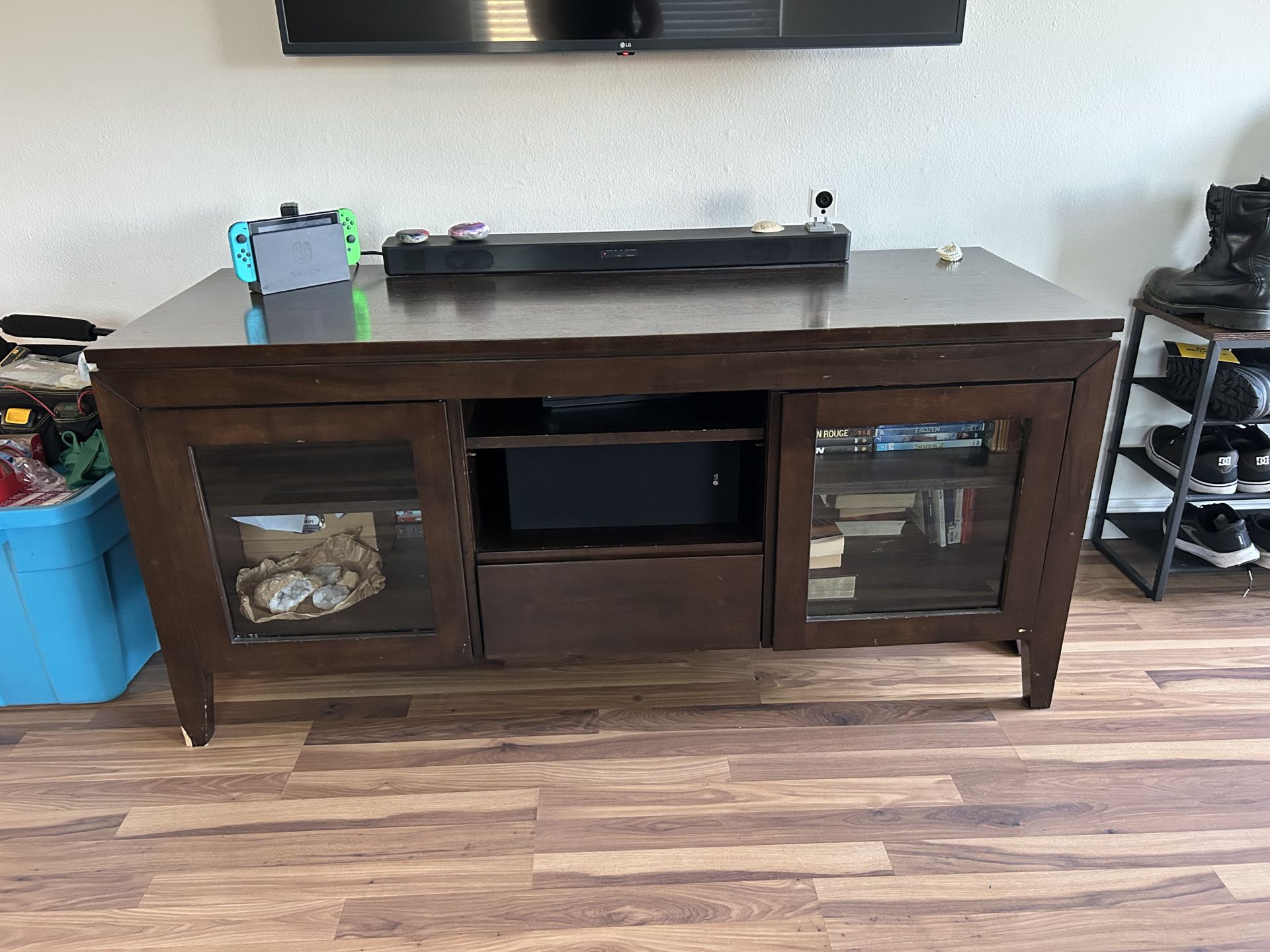 Wood entertainment center with glass windows, center shelves, and center drawer for storage. Few little blemishes from previous move, could probably hide it with a furniture marker just never got around to it. 28”H x 60”W x 22.75” D Moving and won’t fit in our new place.