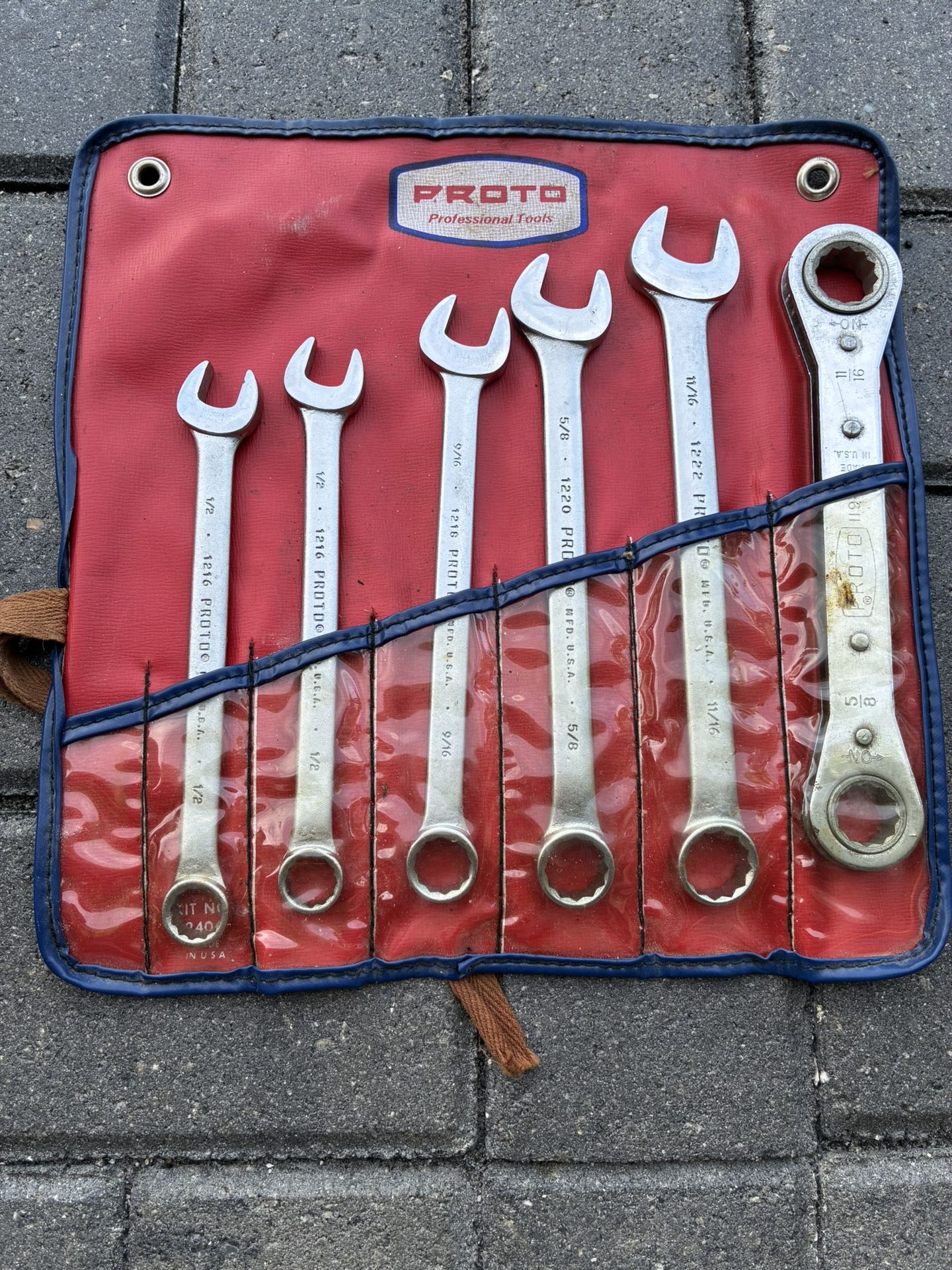 Selling 6 PROTO professional tools SAE wrenches in storage folder. You get 2 number 1216 wrenches, no. 1218 a 9/16 wrench, a no. 1220 5/8” wrench, a number 1222 11/16” wrench and a PROTO ratchet combination 5/8 and 11/16 wrench. All are in very good condition