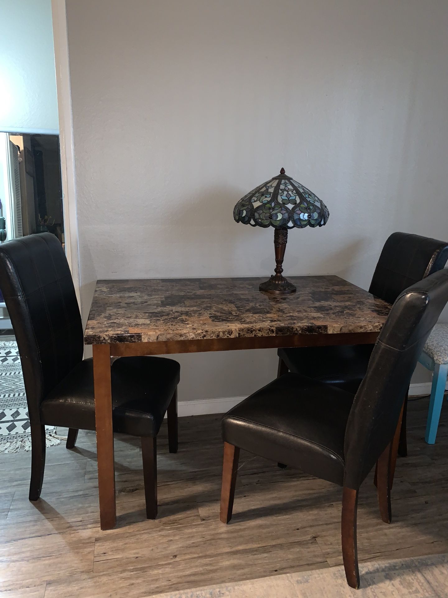 Selling my brown marble table the condition is ok but you can always paint the legs if you want a different color . Only comes with 3 chairs.