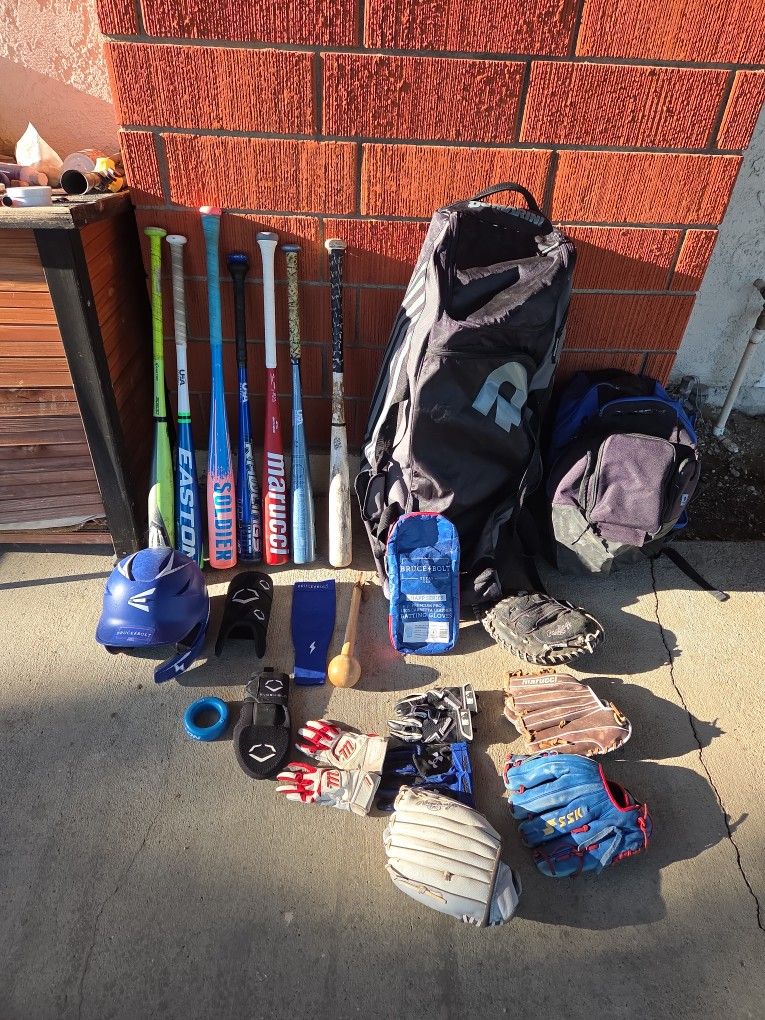 Bats,batting gloves, equipment bags,sliding mitt youth ,leg guard youth,helmet,arm sleeve, bat weight,2 weight baseballs,break in hammer, and gloves. Cleats sizes 4.5 /5 All youth LMK what you want for price