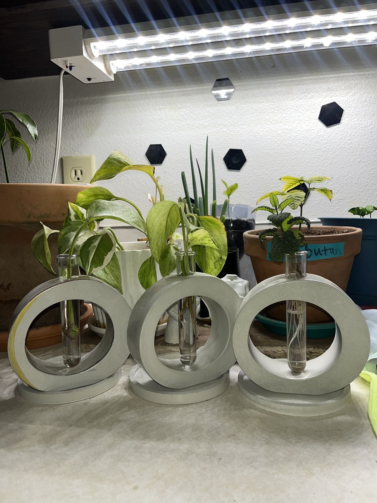 Hand made cement propagating station with pothos clipping with roots, ready to plant.