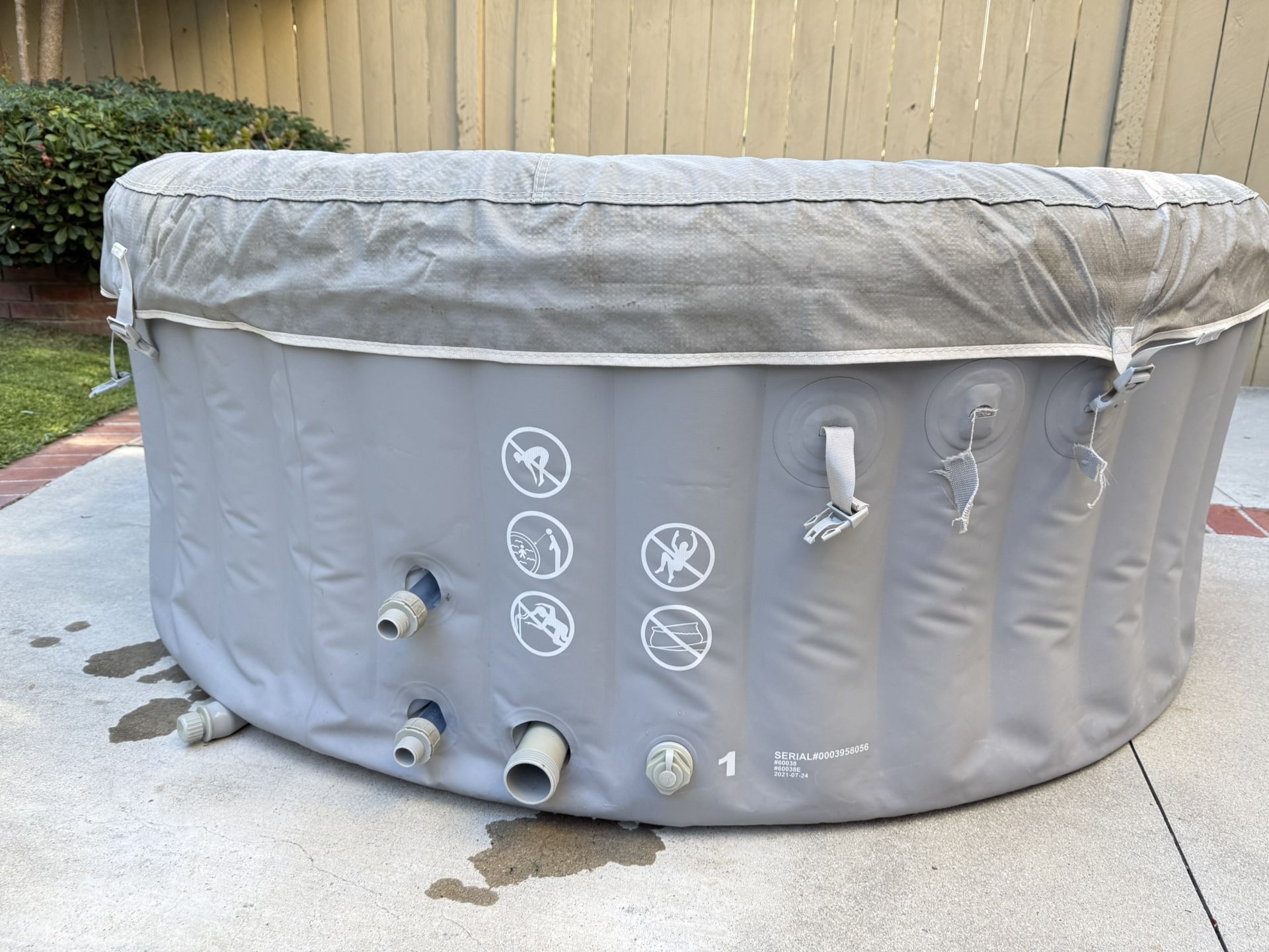Inflatable hot tub for 3 adults. Works great and energy saver. 67” x 26”