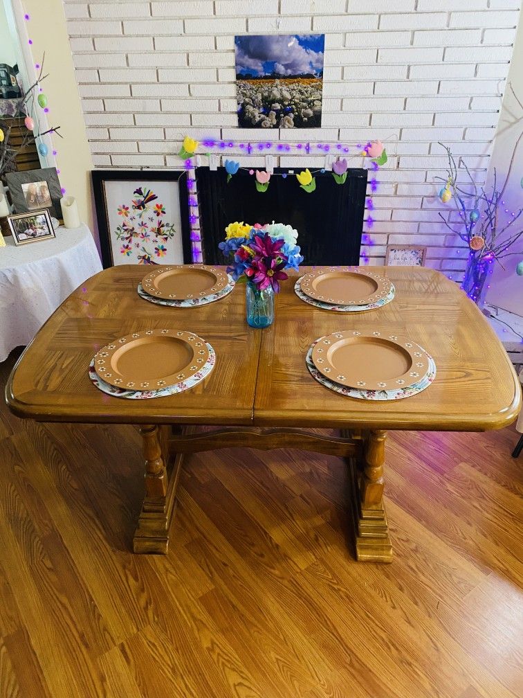 Beautiful, sturdy dining table featuring a unique basketweave parquet wood top and ornate carved trestle legs. This piece is built to last and adds a warm, classic feel to any dining room or kitchen. The honey-oak finish highlights the natural wood grain beautifully. The table is a "trestle" style, meaning there is plenty of legroom for guests without corner legs getting in the way. It is currently shown in its standard size, but it comes with 2 leaves to extend. Leaves have some wear and scuffs but is great for large gatherings that typically require a tablecloth. Key Features: Stunning parquet/checkered wood inlay on the tabletop. Very sturdy trestle base with decorative scroll carvings. Versatile Style: Fits perfectly with Farmhouse, Traditional, or Mid-Century decor. Condition: Excellent overall vintage condition. Has some minor surface wear in one area/ very light scuffs on small part of edge consistent with age (see photos), which adds to its character. NOTE : Other white lines on edges of table are light reflections, not damage. See photos 220 obo