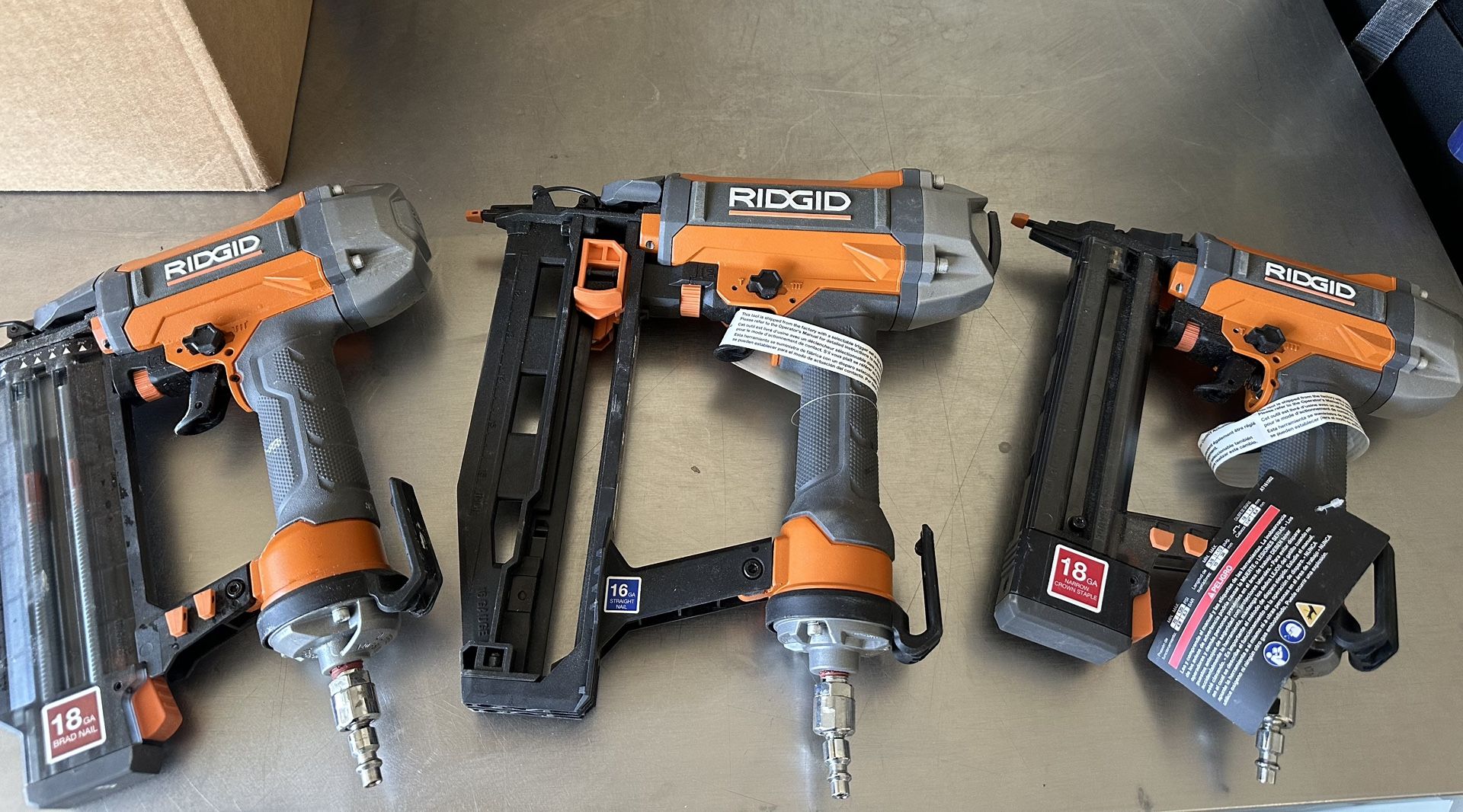 Rigid pneumatic nail and staple guns. Will sell as a set or separately. Buying them all together will get the better price per piece. $170 for all three pieces or… 1.) Rigid 16ga straight nailer fastener min/max size: 1 1/4” - 2 1/2” (brand new never used) $95 2.) Rigid 18ga narrow crown stapler. fastener min/max size: 3/8”-1 1/2” (brand new never used) $45 3.) Rigid 18ga brad nailer fastener min/max size: 5/8” - 2 1/8” (lightly used for one project). $45