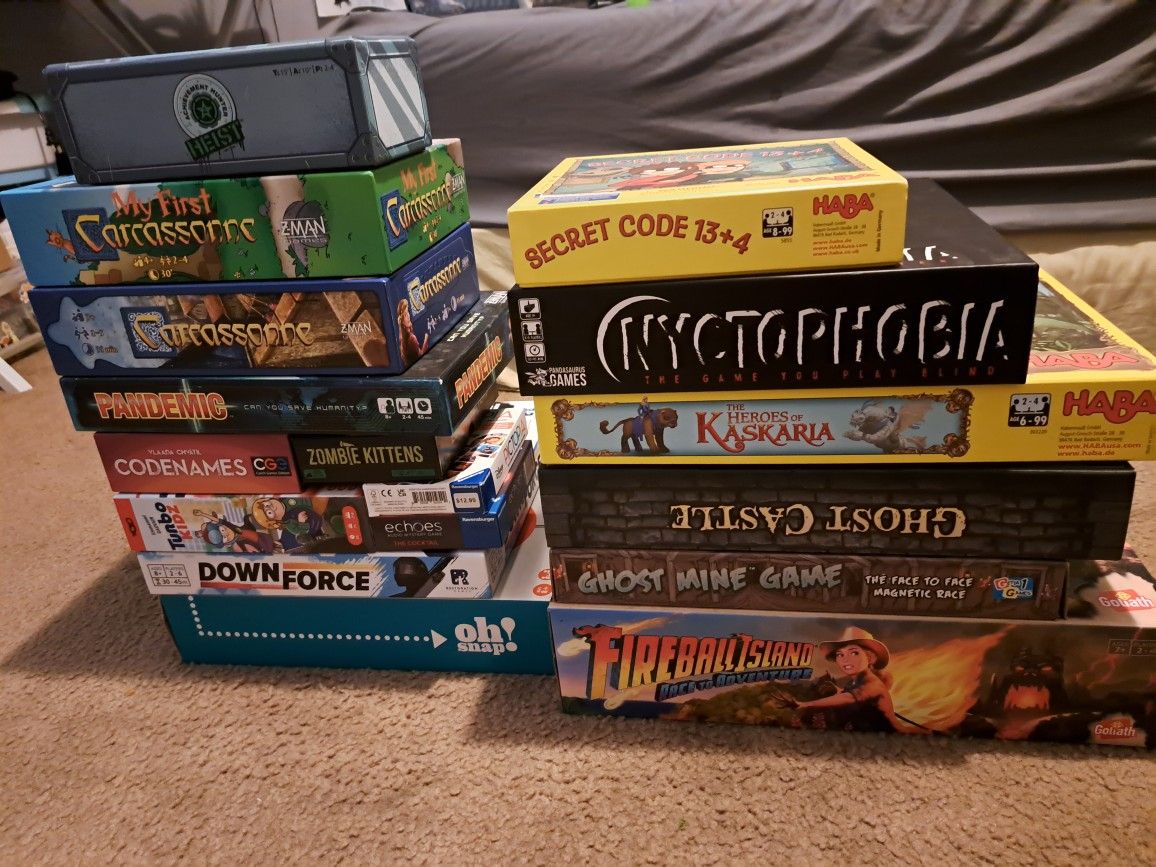 Pick up in long beach $95 for the lot •Fireball Island $15 •Heros Of Kaskaria $15 •Secret Code 13+4 $10 •Ghost Castle $10 •Ghost Mine Game $5 •Heist $10 •My first Carcassonne $10 •Carcassonne $15 •Pandemic $15 •Codenames $10 •Zombie Kittens $10 •Pictopia $5 •Echoes $10 •Turbo Kidz $10 •Downforce $15 •Oh Snap $5 •Nyctophobia $15