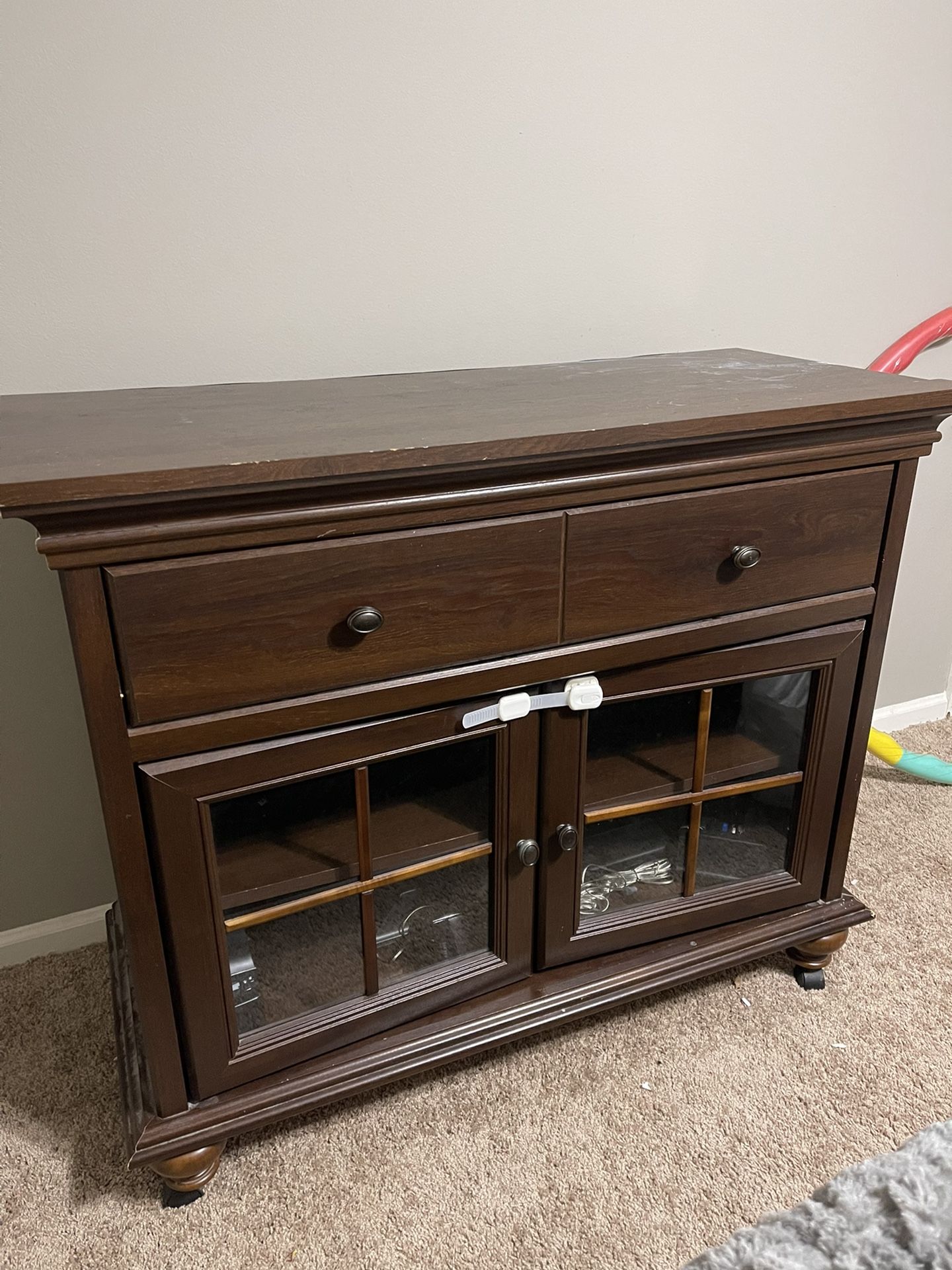 Good TV Stand can hold a TV up to 50”. Everything still works fine. We are hanging Our TV, so we no longer need it. (The things inside are not included). Cash and pick up only (inbox for more questions if really interested)—no low ball bargain.