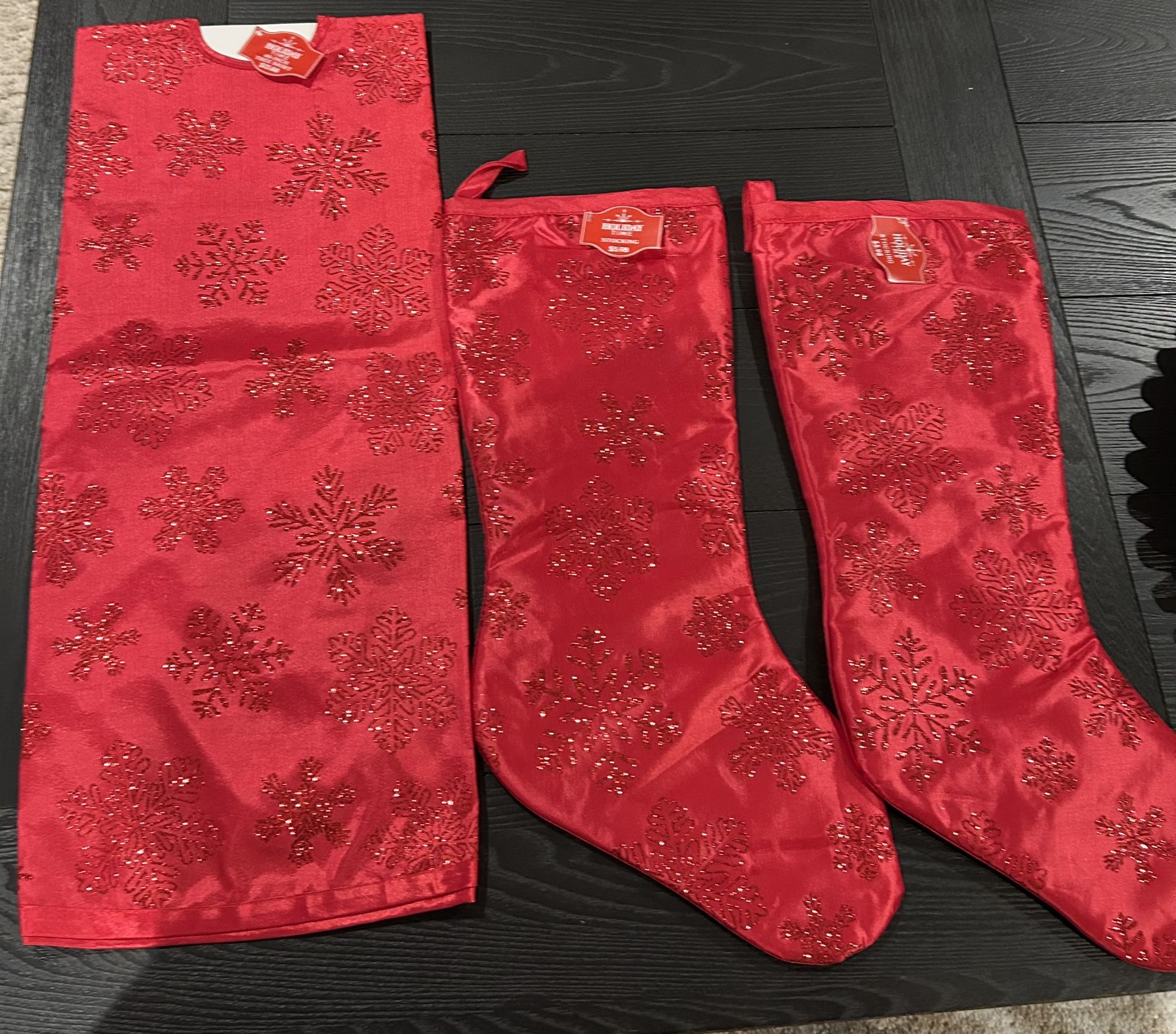 Tree skirt with matching stockings Red with snowflake glittering design All three brand new with tags still on them All 3 for $10