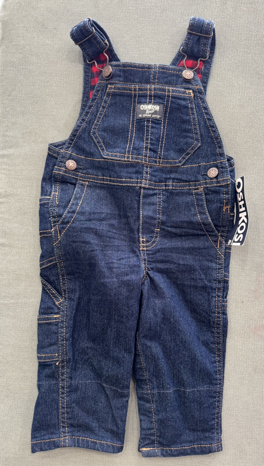 Size 12 months overalls NEW with tag Jean overalls with red plaid print inside Perfect for Christmas outfit Pet/smoke free home