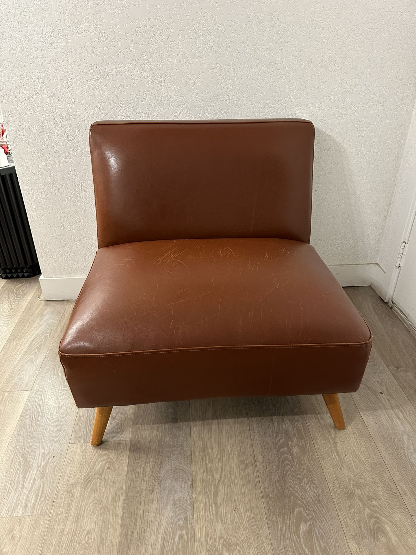 Huxley Armless Leather Chair sold by World Market Mid century style Has some scratches from dog Cushion is perfect. Hardly sat on it used just for decoration. Asking $180