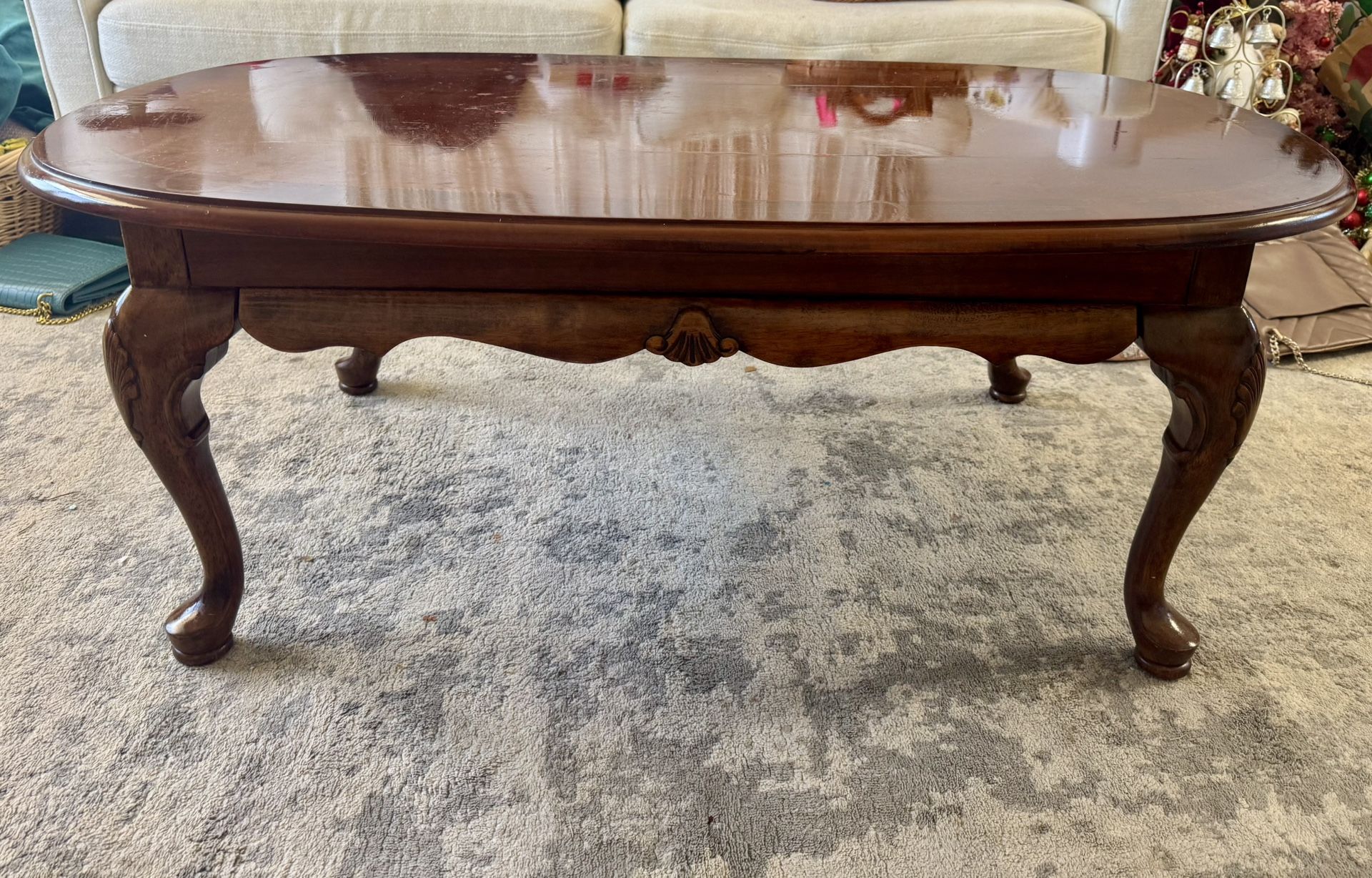 oval coffee table in a rich cherry/mahogany finish. classic cabriole legs and an elegant shell-carved detail. Perfect for a traditional living room or as a high-quality base for a DIY/chalk paint project. Dimensions: Length: 46in Width: 27in Height: 18in Price: $75 (Open to reasonable offers)