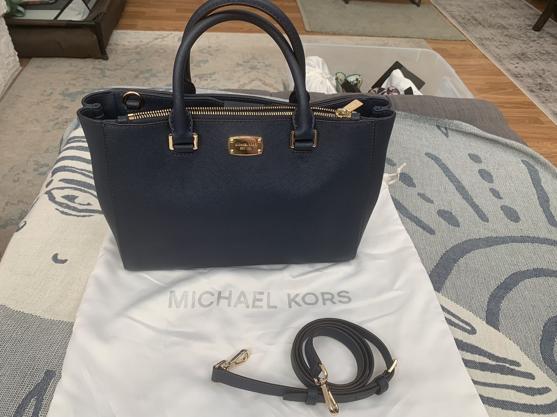 Michael Kors handbag with crossbody strap. Storage bag and stuffing included. Good (used) condition. Navy color, gold hardware. Lots of storage/pockets