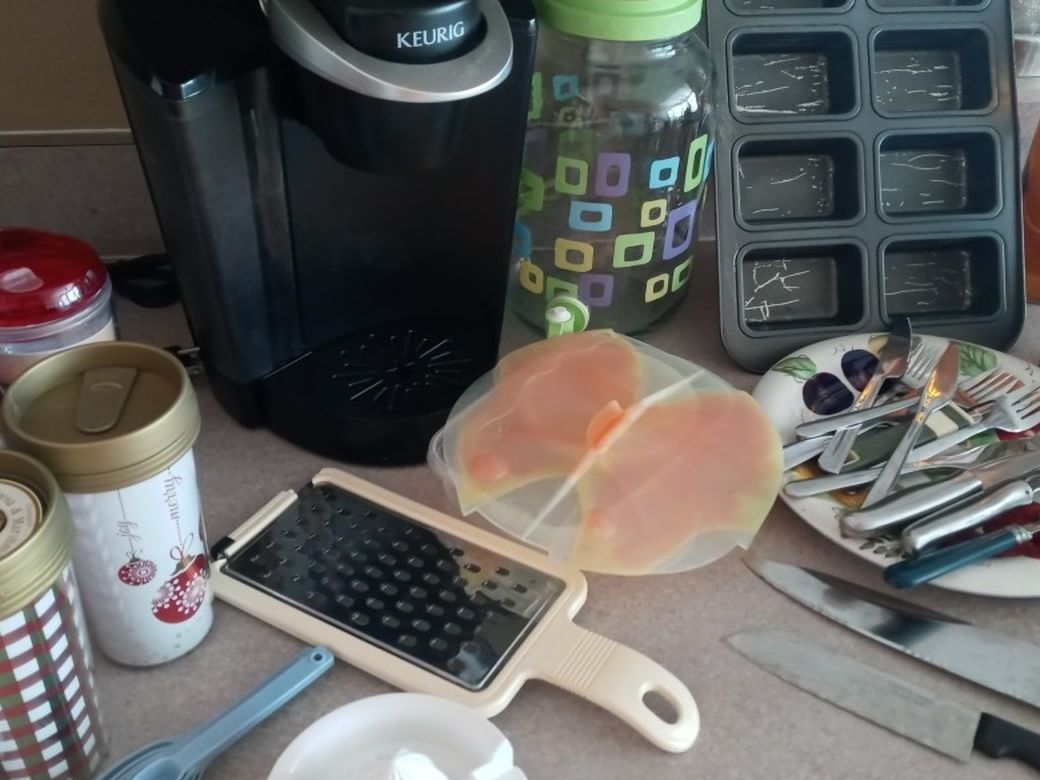 Keurig coffemaker, very good cond, glass liquid container with spout, brand new, mango syrup for cocktail drinks, brand new, Christmas tumblers, brand new, a bottle of homemade wine, never opened, a large farberware knife and a medium size ginsu knife, a food warm keeper top, new, some pieces of silverware, etc. All for $50....usually the price of the Keurig alone.
