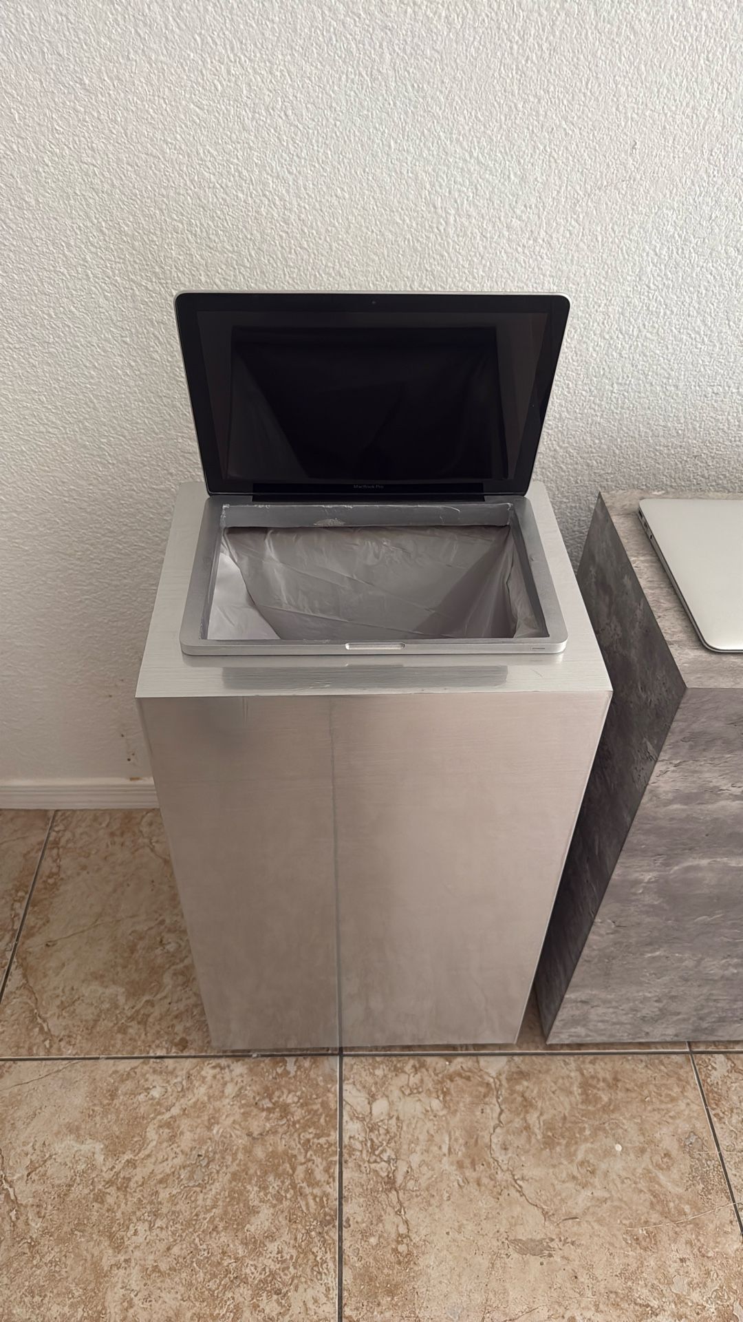 If you are looking for a sleek trashcan that does not look like a trash can, discrete and clean. Sure to turn heads every time someone throws something away. Looks good in kitchen, office, etc. (Custom made) (Stainless steel vinyl wrap) Dimensions 15” w 12.5 L 24.5 T Standard 13 gallon trash bag Pick up only location is fountain hills 350.00 cash
