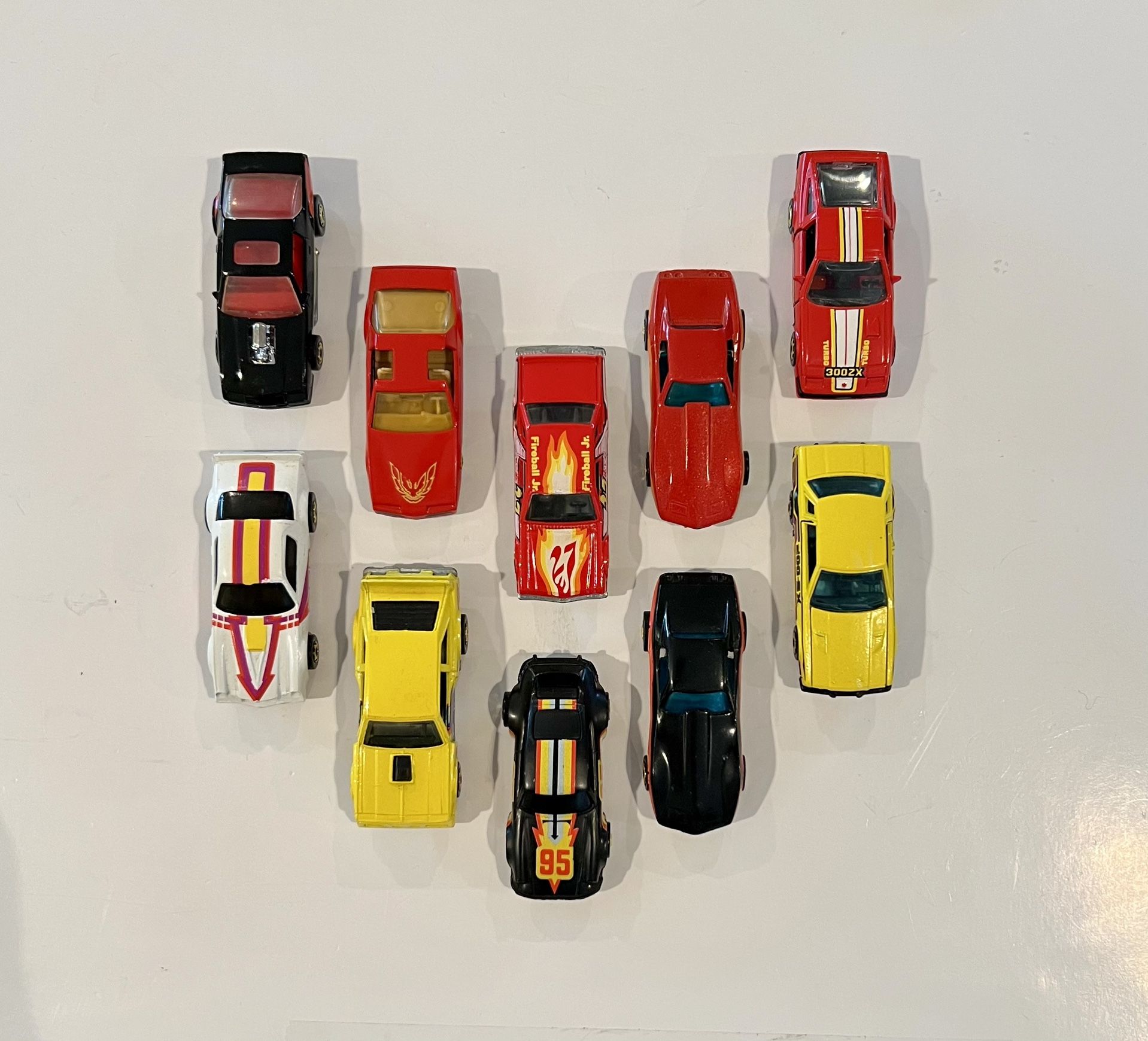 These Hot Wheels were made in Hong Kong and Malaysia and are in really good to excellent used condition overall. The 1982 Camaro Z-28 has the misspelling error “CAMRO” on the bottom. 1982 Yellow Flat Out 442 - HK Excellent 1982 Yellow Datsun 200SX - HK Excellent 1982 Black P-911 -HK Excellent 1982 Black Corvette - HK Really Good 1982 White Camaro Z-28 - HK Really Good 1983 Metalflake Red Corvette - HK Really Good 1983 Red 80’s Firebird - HK Excellent 1983 Red Front Runnin’ Fairmont - HK Excellent 1984 Black Blown Camaro - Malaysia Excellent 1985 Red Nissan 300ZX - HK Excellent