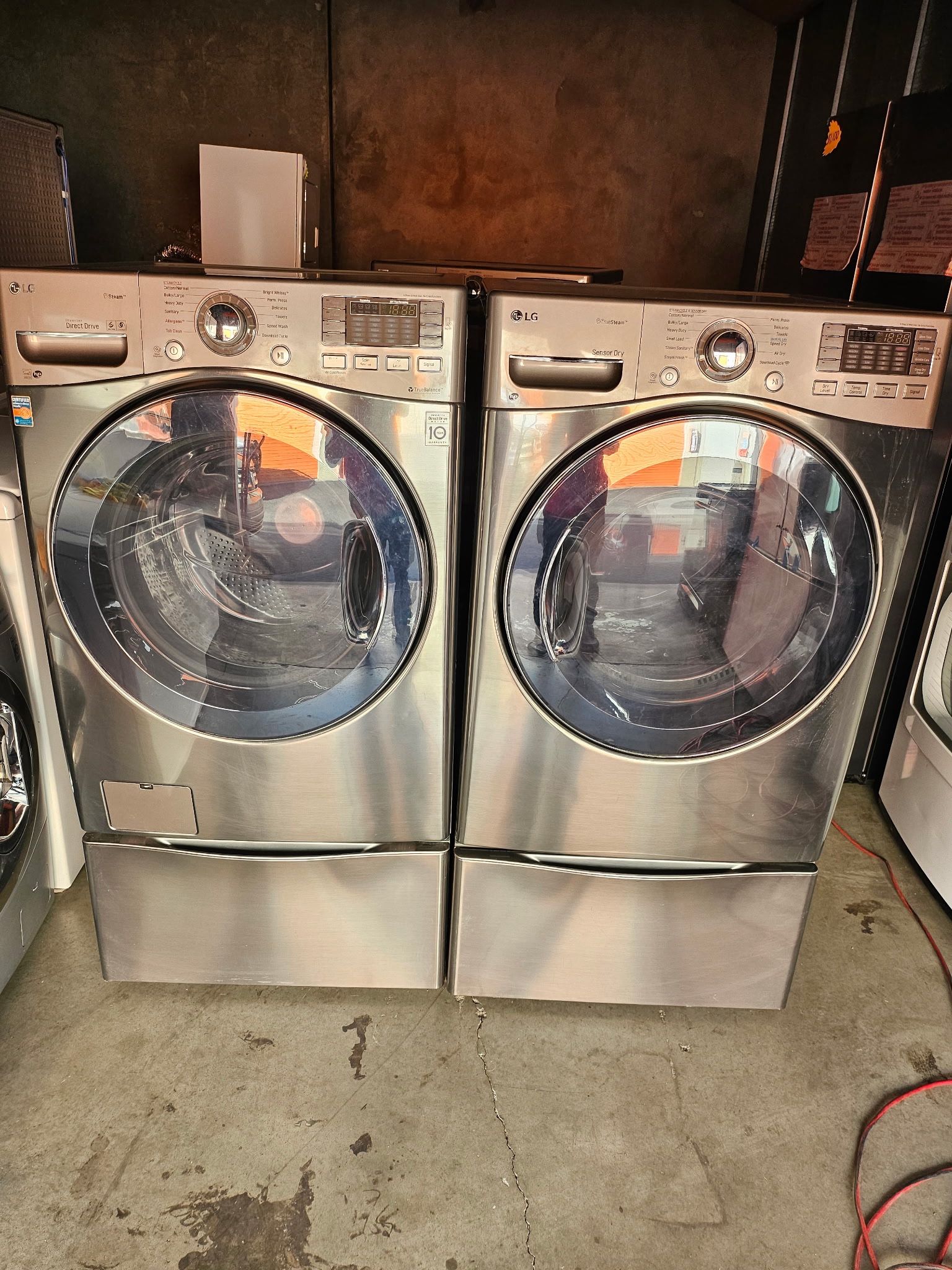 Lg frontal washer and gas dryer set with pedestals both are in great working condition and clean Plus 4 months warranty 🚚delivery and set up us available ❗️by appointment only